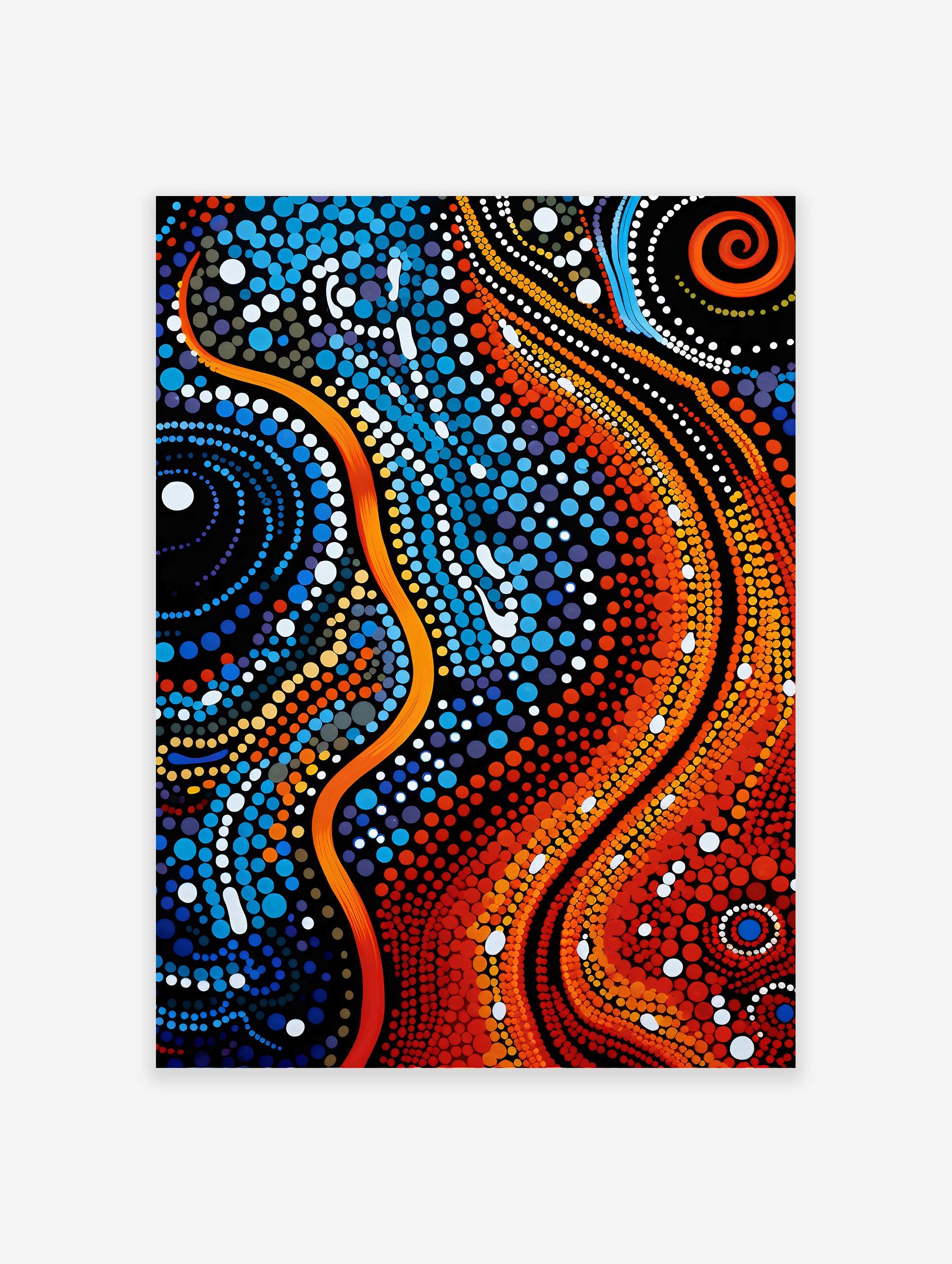 Enhance your walls with our captivating Aboriginal Art Print featuring vibrant abstract dot patterns. Explore our collection of authentic Aboriginal poster to add cultural flair to your space.