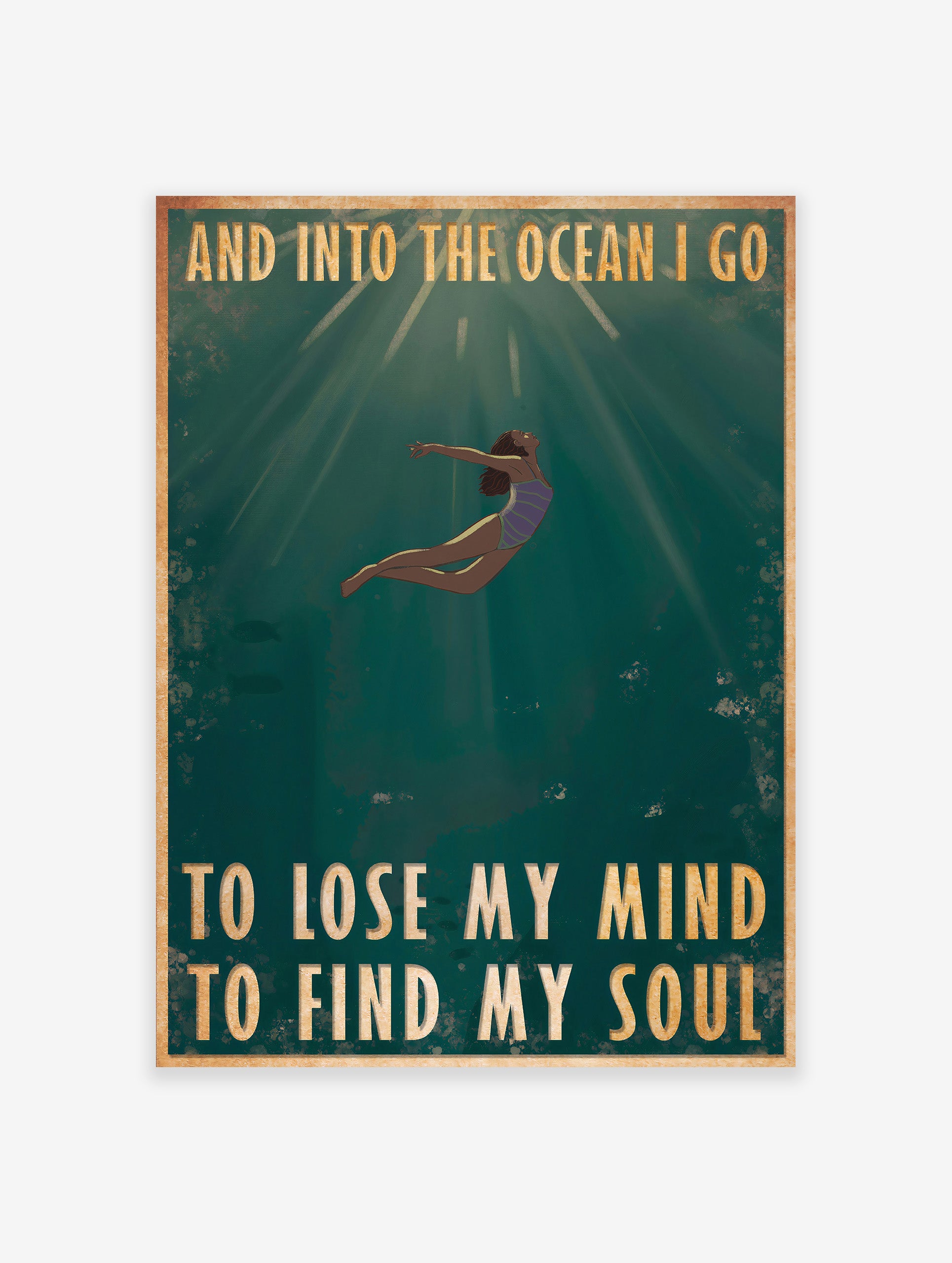 This poster features a woman immersed in the depths of the ocean and typography saying 'Into the ocean I go, to lose my mind and find my soul'. Elevate your space with this mesmerizing poster, perfect for adding a sense of calm and wonder to any room.
