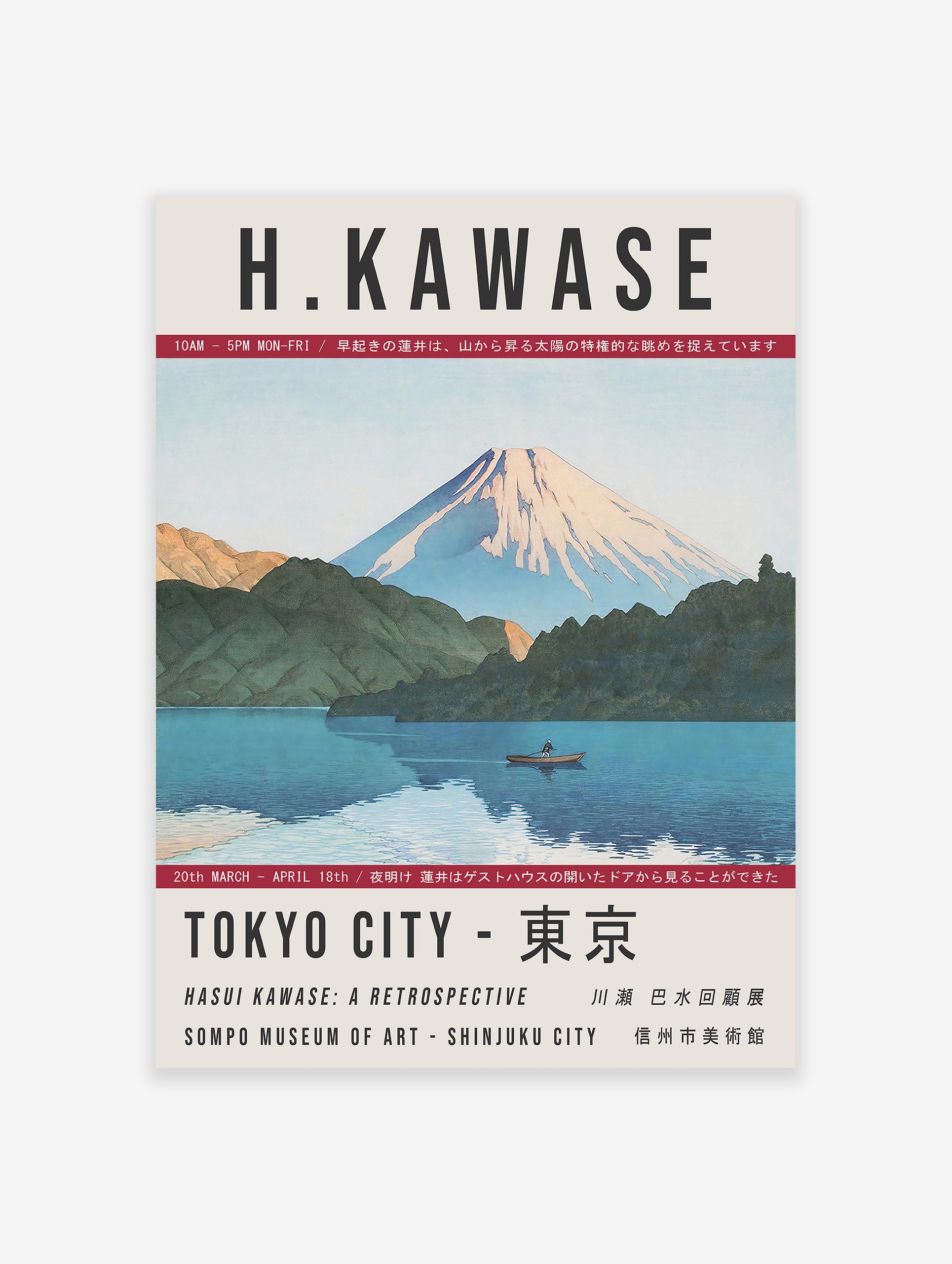 Enhance your environment with the mesmerizing charm of Ashino Lake at Hakone portrayed in this Kawase Hasui Poster. Highlighting a seamless fusion of tranquil waters and the grandeur of Mount Fuji, this artwork embodies the essence of Japanese landscape art, ideal for adorning your home or office space.