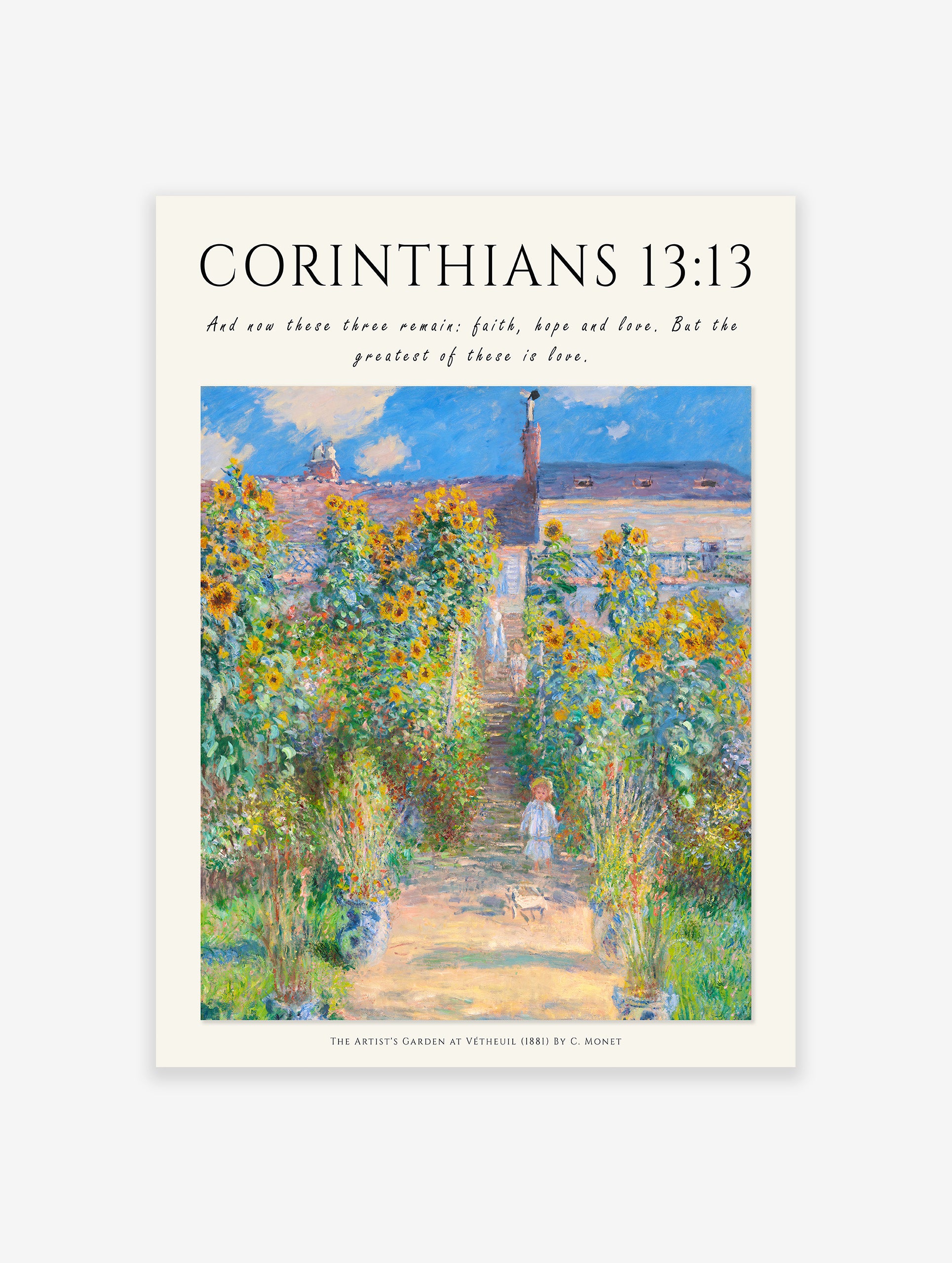 Immerse yourself in Christian Art by Claude Monet, harmonizing a tranquil green-toned garden painting with a timeless Bible verse, ideal for spiritual contemplation and interior decoration.