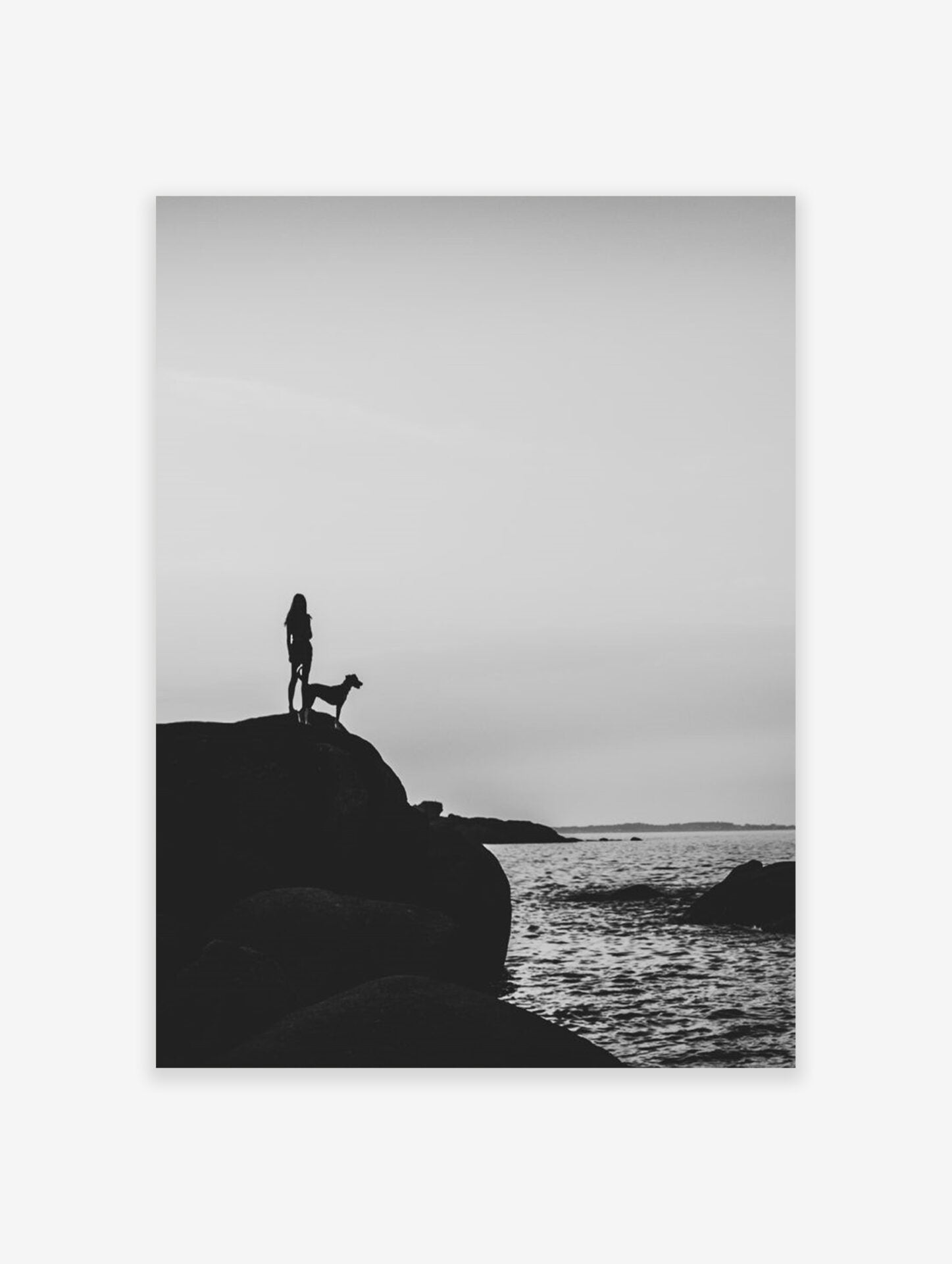 This intimidating black & white poster of a woman silhouetted on a cliff captures the essence of adventure wall art, coastal living poster, and nature photographic poster.