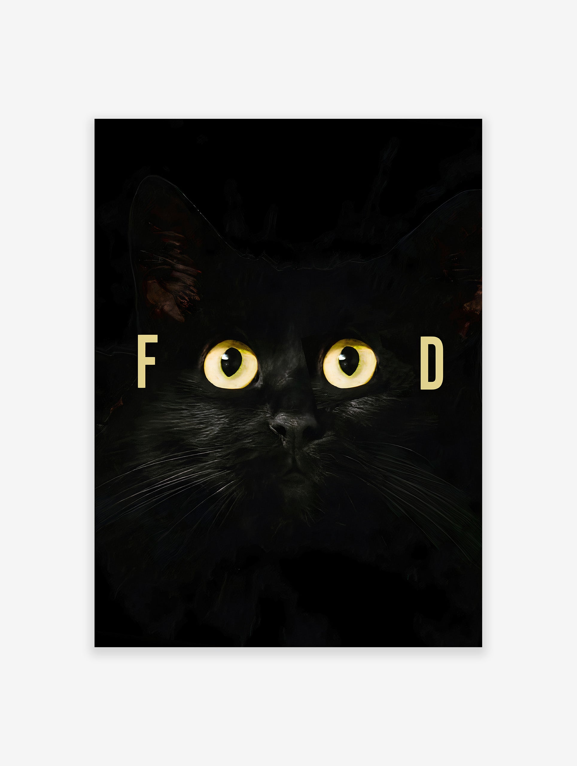 Elevate your decor with this captivating Black Cat Eyes Food Print, featuring mesmerizing cat eyes within the word "food" against a sleek black background. Perfect for cat lovers and modern art enthusiasts, this poster adds a touch of mystery and sophistication to any space.