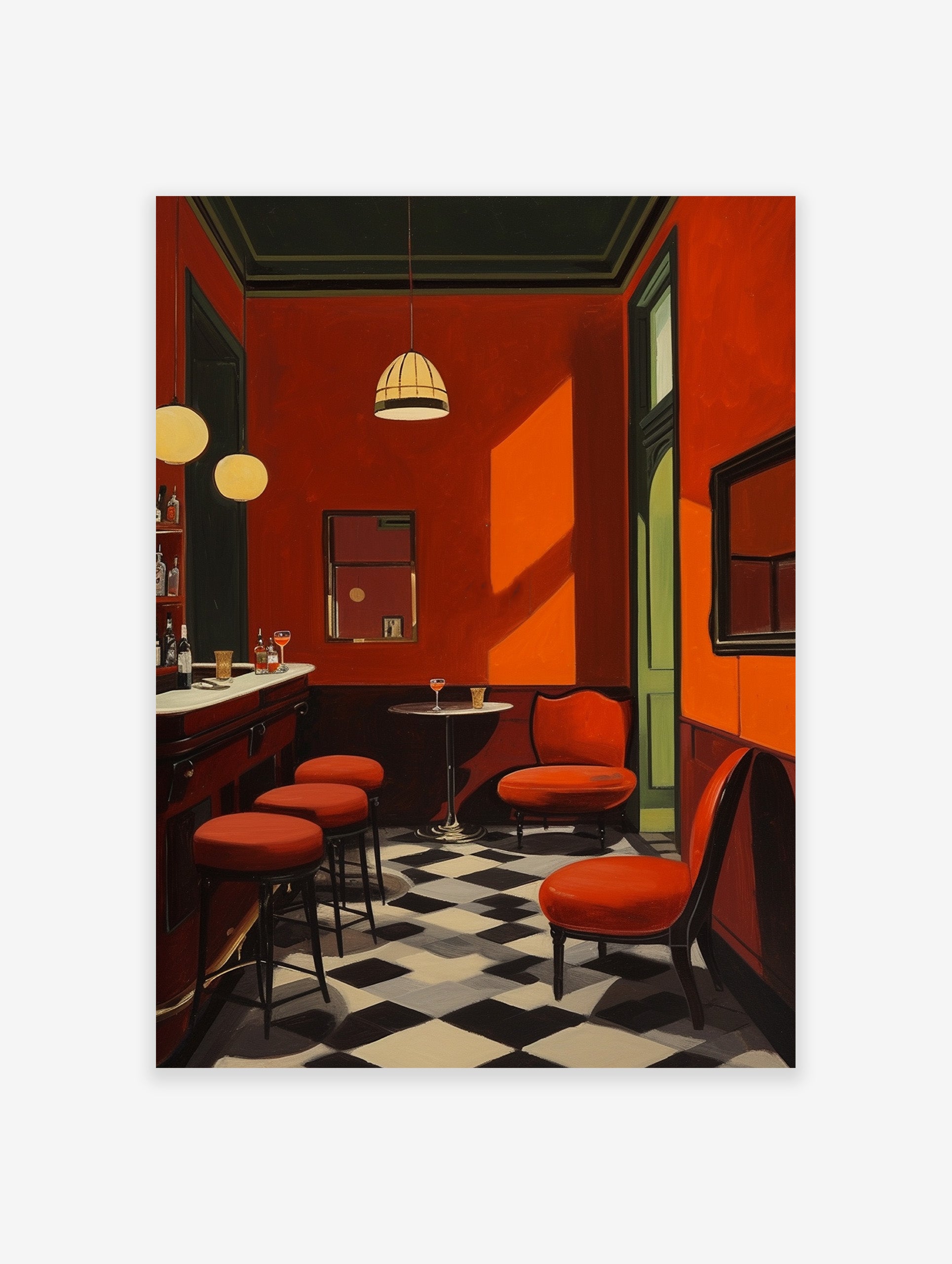 Elevate your decor with our Boho Cocktail Bar Wall Print featuring a captivating bohemian artwork of a cocktail bar counter in warm red tones. Infuse your space with eclectic charm and sophistication with this unique print.