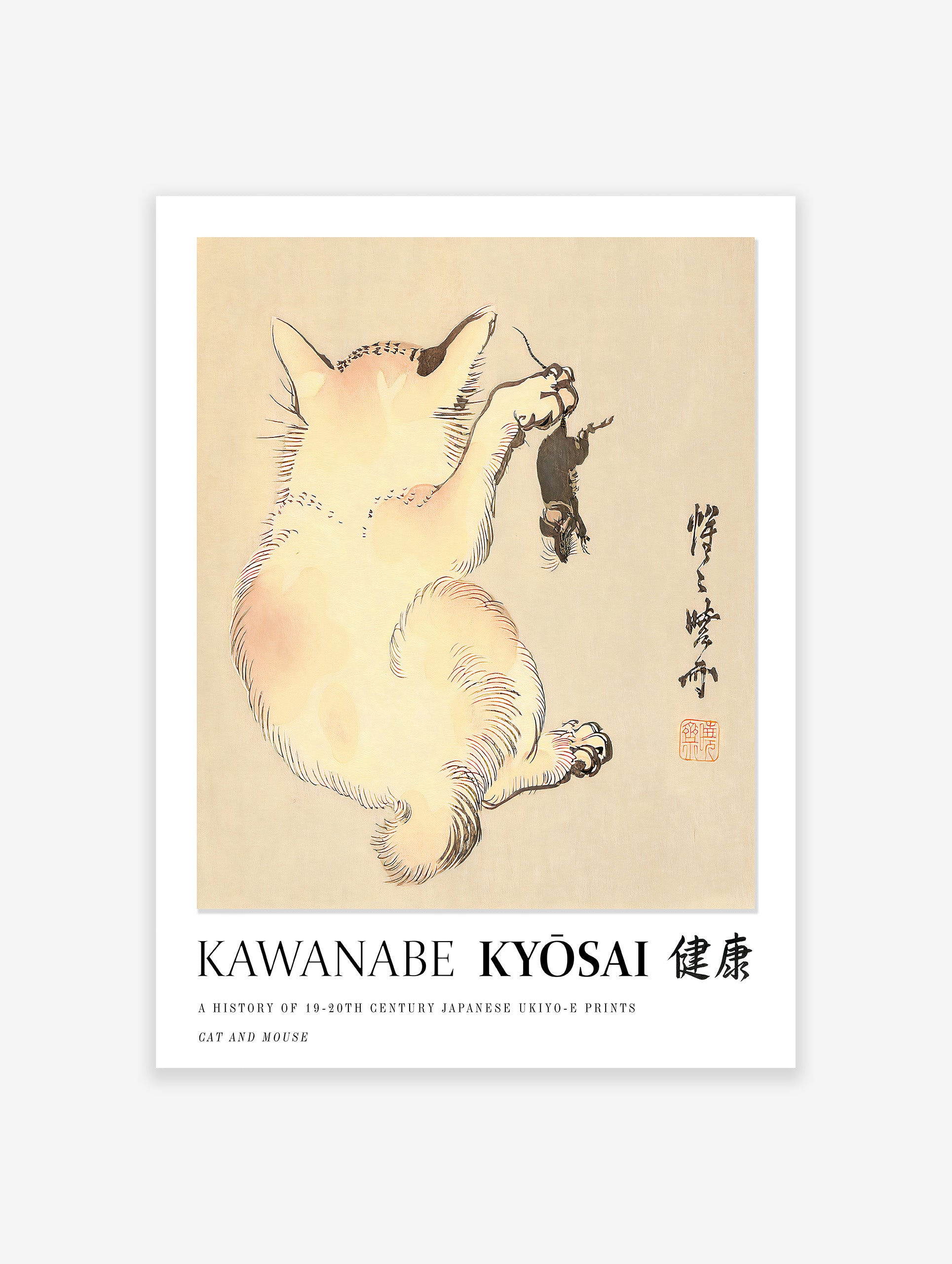 Discover the captivating world of Japanese art with this Kawanabe Kyosai Poster, featuring a charming depiction of a cat holding a mouse. Perfect for art enthusiasts and lovers of traditional Japanese painting, this print adds a touch of whimsy and culture to any space.