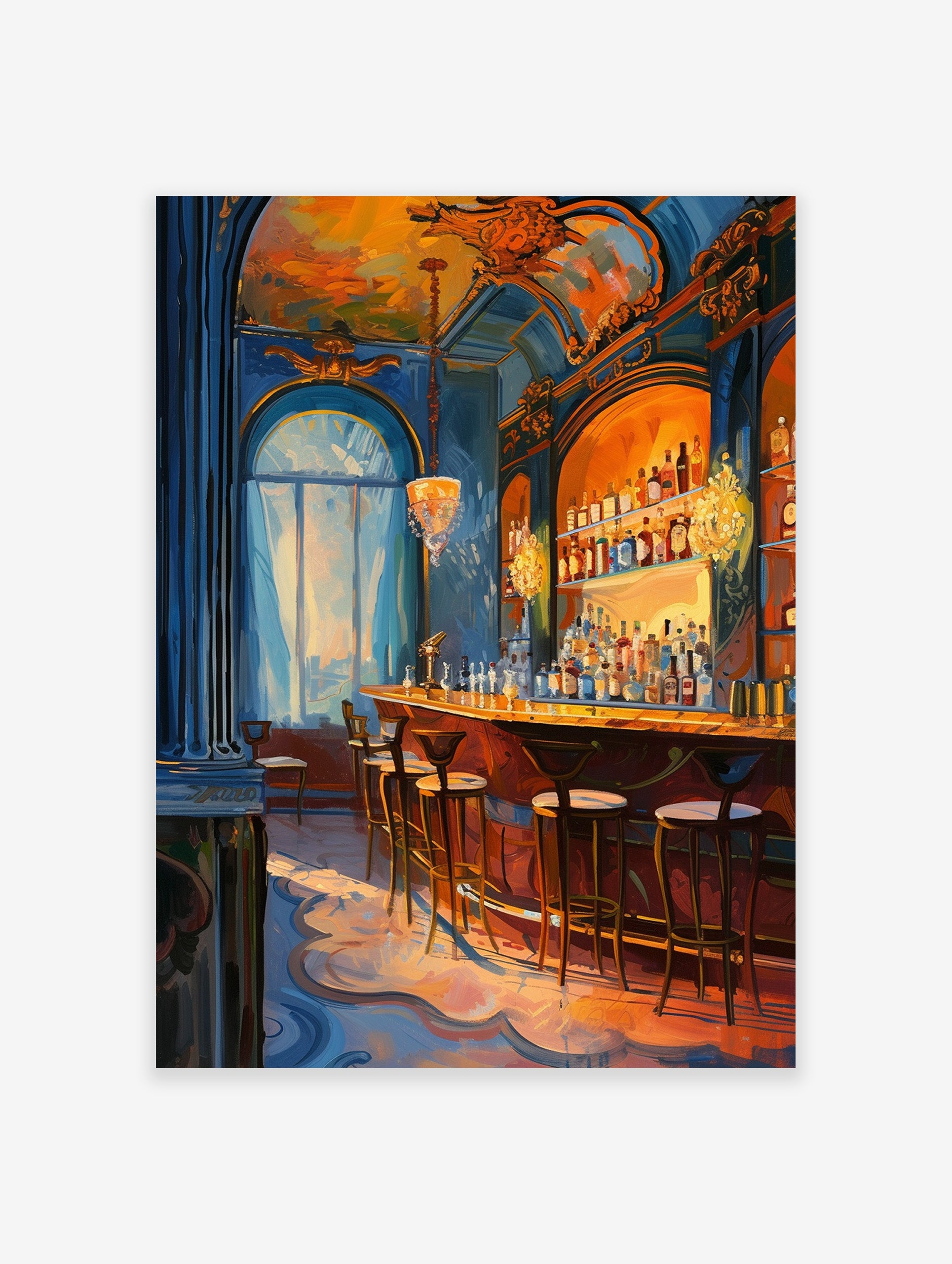 Transform your wall with our captivating Cocktail Bar Art Poster showcasing a vintage cocktail bar in mesmerizing orange tone, perfect for adding a touch of retro elegance to any space.