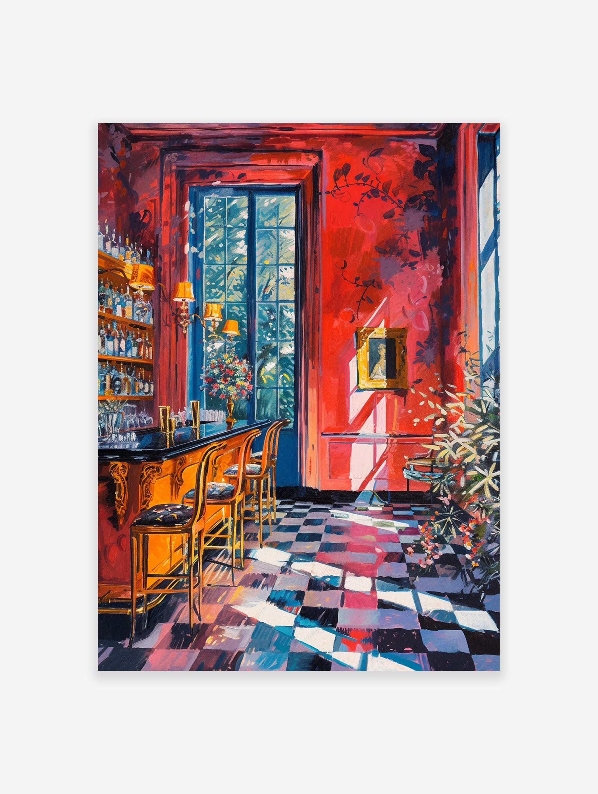 Transform your space with our vibrant Cocktail Bar Wall Print, showcasing a stylish cocktail bar counter bathed in captivating red tone. Elevate your decor with this eye-catching artwork, perfect for adding flair to any room.