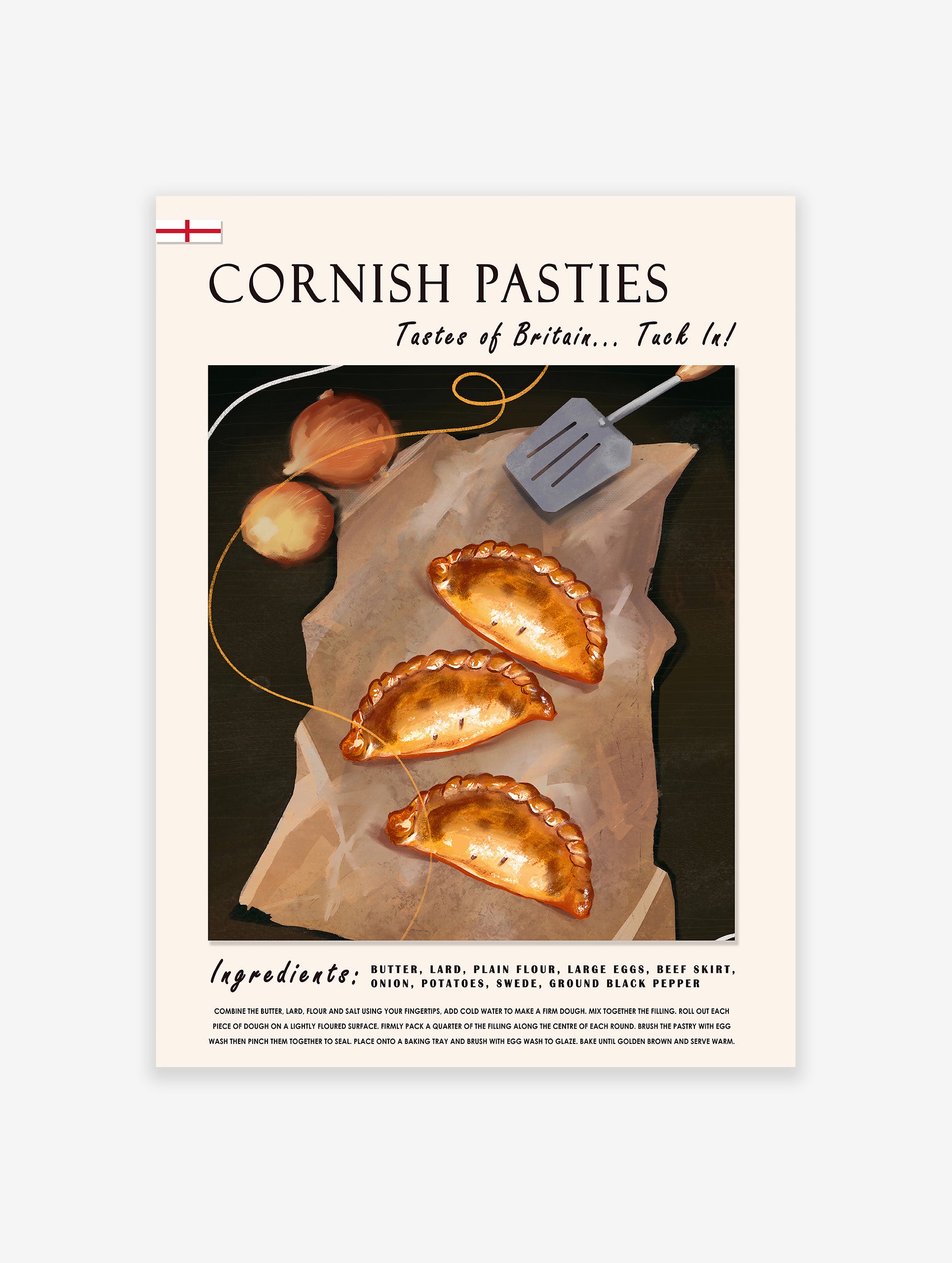Indulge in the savory delight of Cornish Pasties with this mouthwatering food print, perfect for culinary enthusiasts. Elevate your kitchen decor with this British Food Poster, celebrating the rich flavors and cultural heritage of British cuisine.