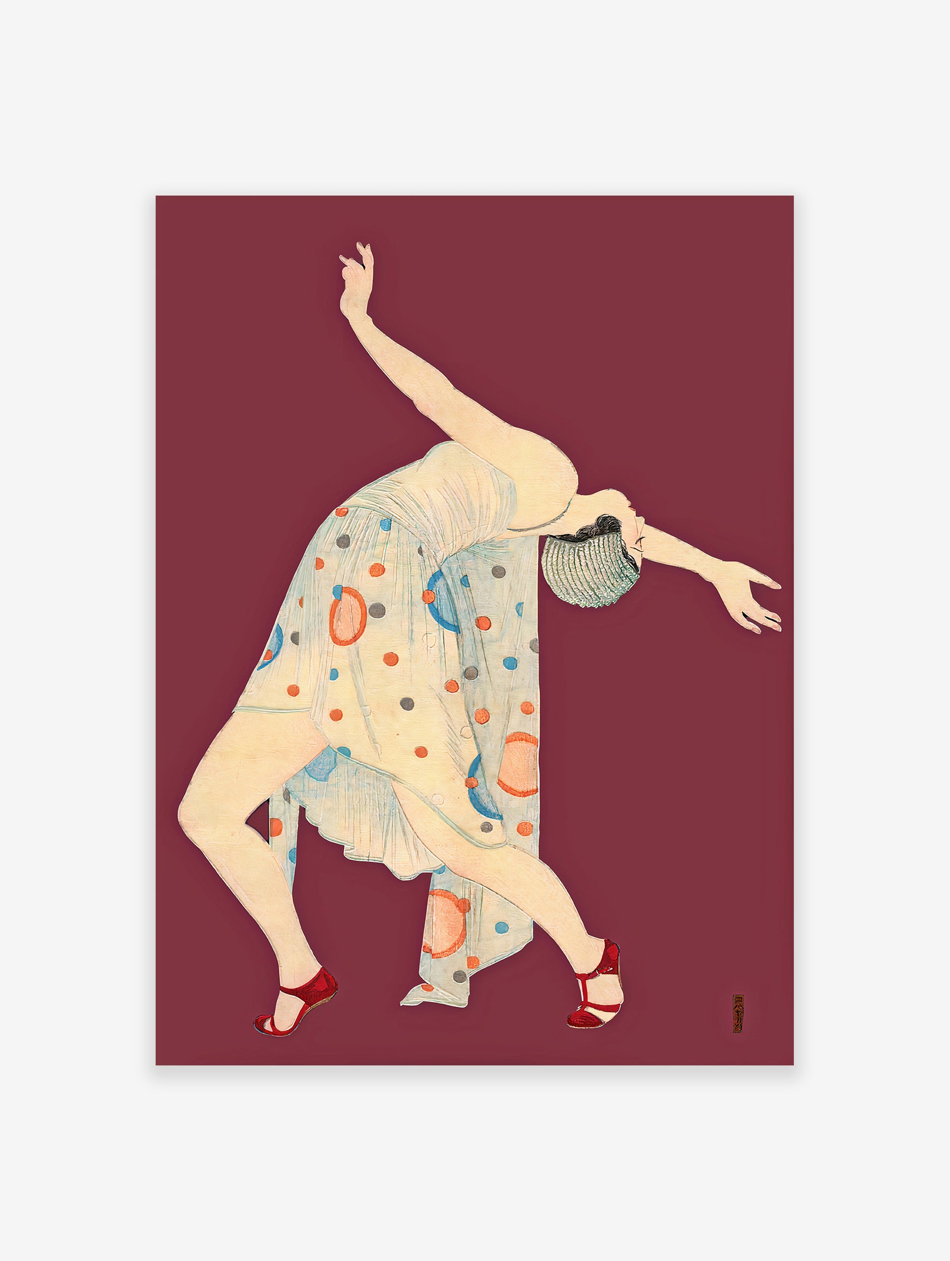 Experience the graceful movements captured in Kobayawaka Kiyoshi's Dancer Print, featuring a woman dancing amidst a purple background. Elevate your decor with this captivating artwork, perfect for art enthusiasts, dance lovers, and those seeking elegant wall art.
