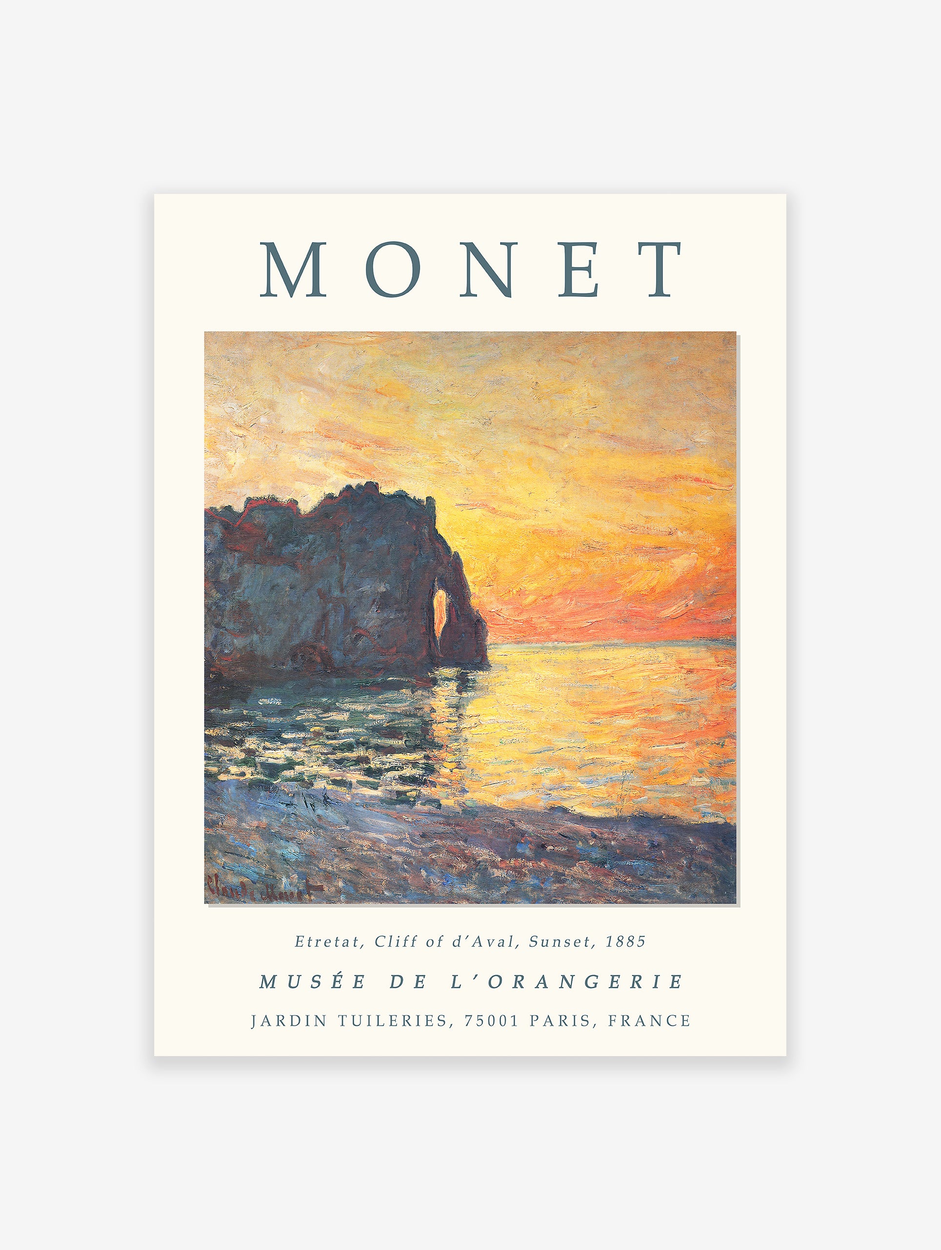 Capture the breathtaking beauty of nature with this Claude Monet Poster featuring the stunning cliffs and vibrant sunset of Etretat. Elevate your space with this iconic artwork, perfect for art enthusiasts and nature lovers alike.