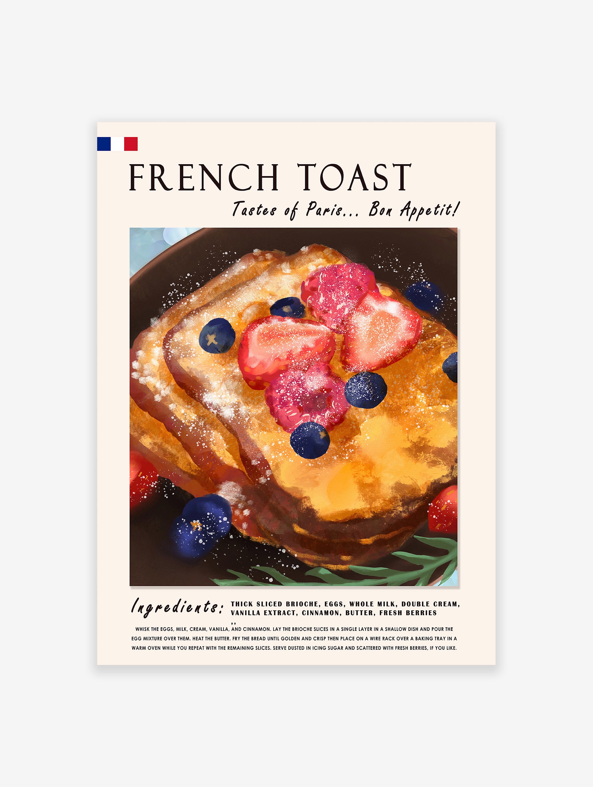 Indulge in the culinary delight of our French Food Poster featuring mouthwatering French Toast Food Art. Elevate your kitchen decor with this appetizing artwork, perfect for food enthusiasts and home chefs alike.