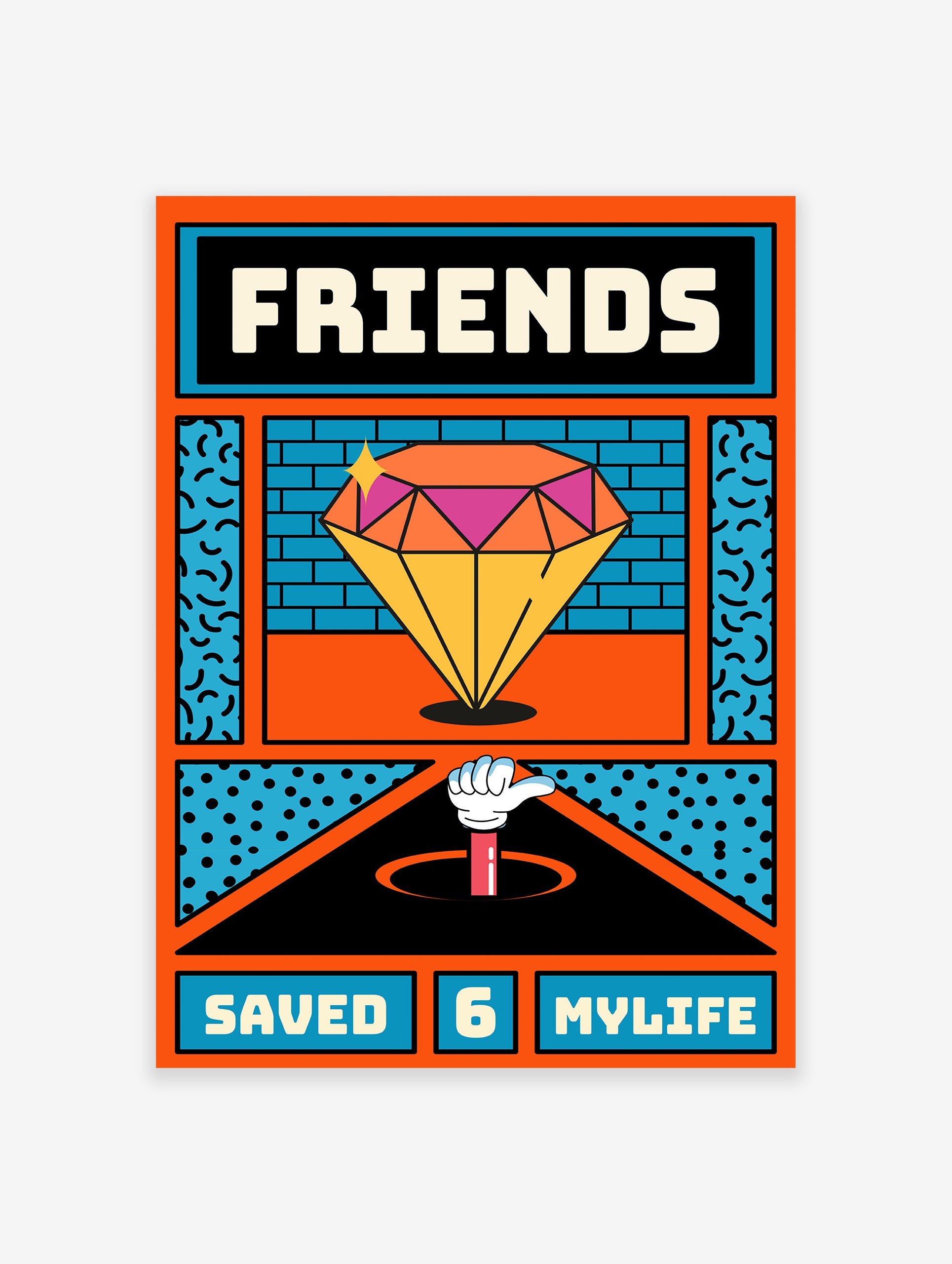 Transform your room with this motivational 'Friends Save My Life' quote poster featuring a striking diamond background in warm orange tones, ideal for those seeking inspiring decor.