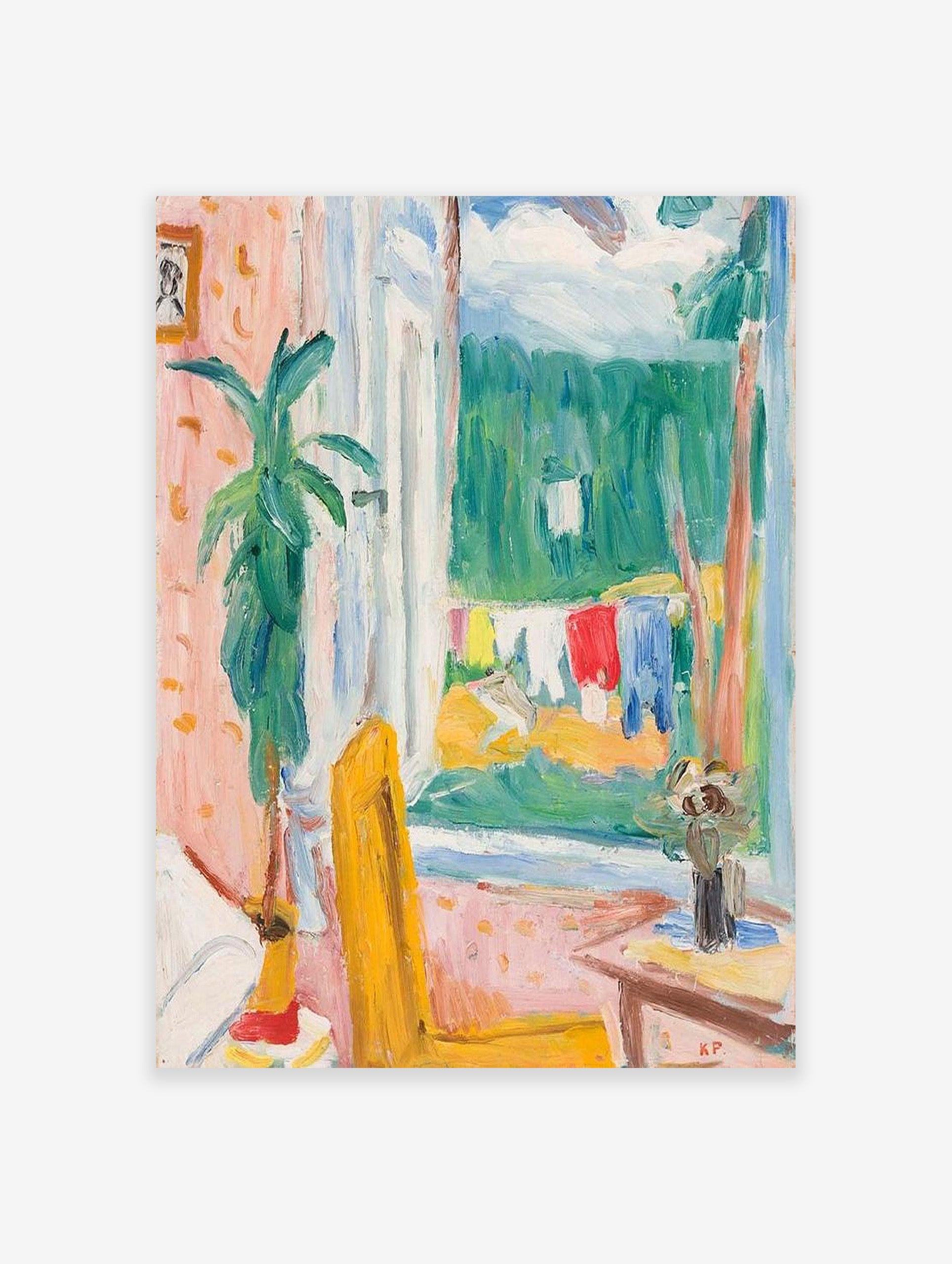 Elevate your home decor with the Marine - Green and Gold No. 2 Print, featuring a captivating portrayal of a backyard scene viewed from indoors, adorned with lush green tones and subtle gold accents, adding sophistication and charm to any space.