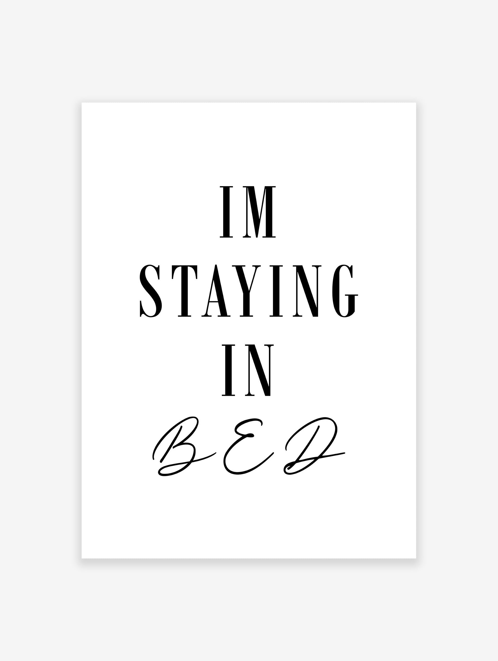 Transform your space with this minimalist "I'm Staying in Bed" typography poster, perfect for adding a touch of humor and style to your bedroom decor. Embrace relaxation and self-care with this chic black and white print, ideal for modern interiors.