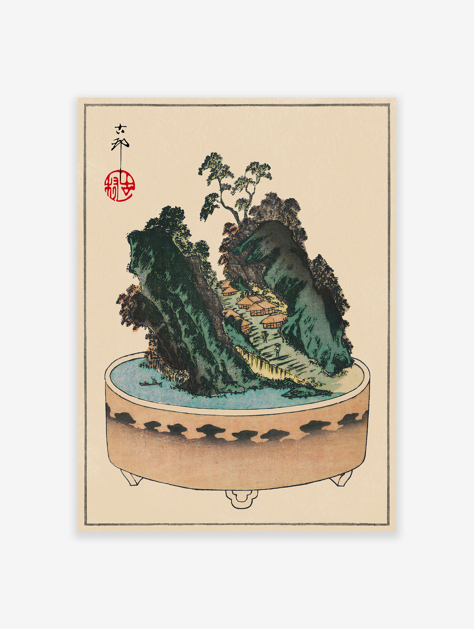 Immerse yourself in the timeless charm of this Vintage Japanese Poster, featuring a serene bonsai tree set against a backdrop of a picturesque mountain village in soothing green tone. Perfect for collectors of Japanese art and nature enthusiasts, this print brings a touch of tranquility and cultural elegance to any space.