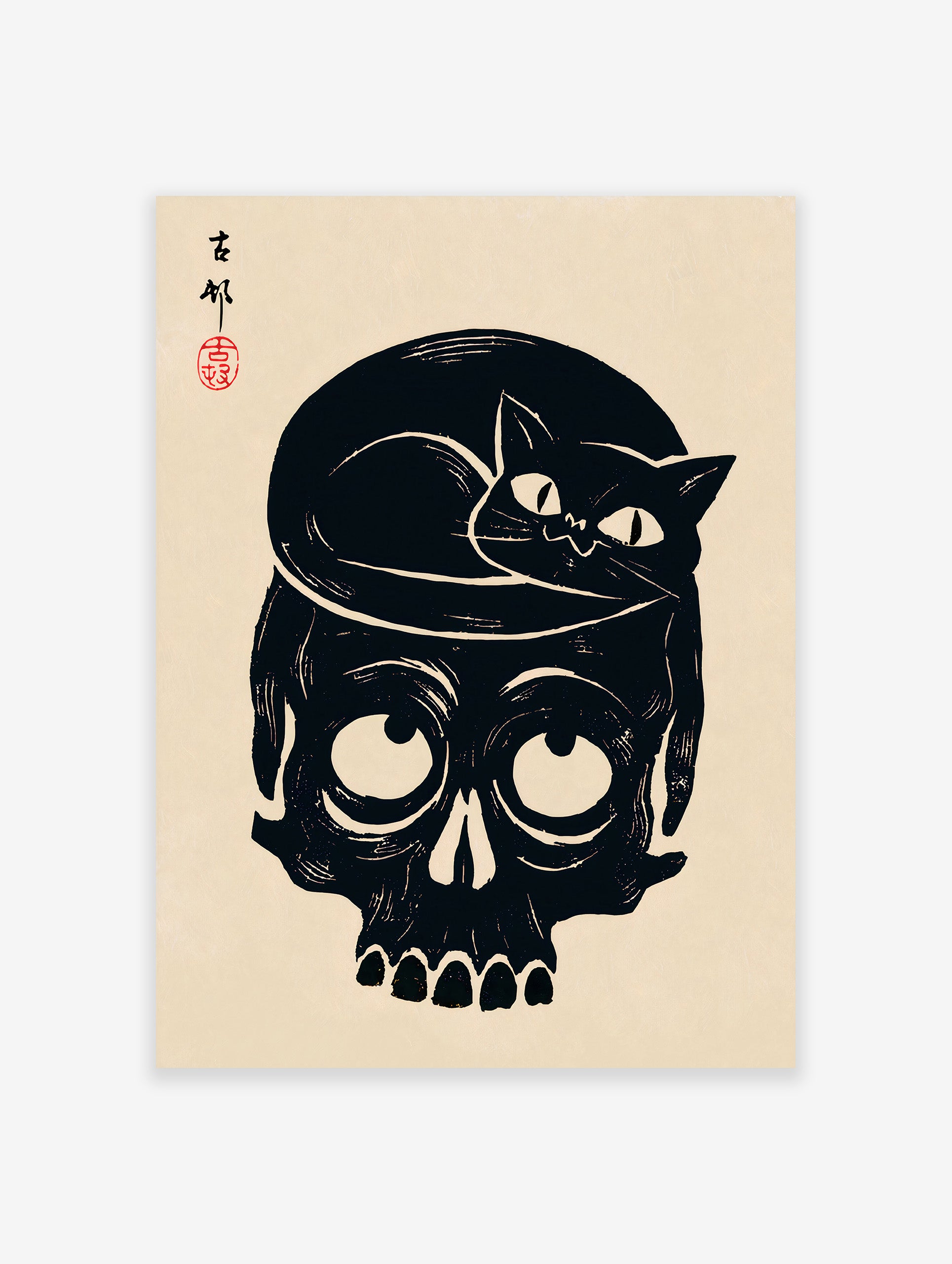 Elevate your decor with this captivating Black Cat Poster, featuring a striking Japanese cat perched atop a skull. Perfect for cat lovers and enthusiasts of Japanese art, this print adds a touch of mystique and intrigue to any space.