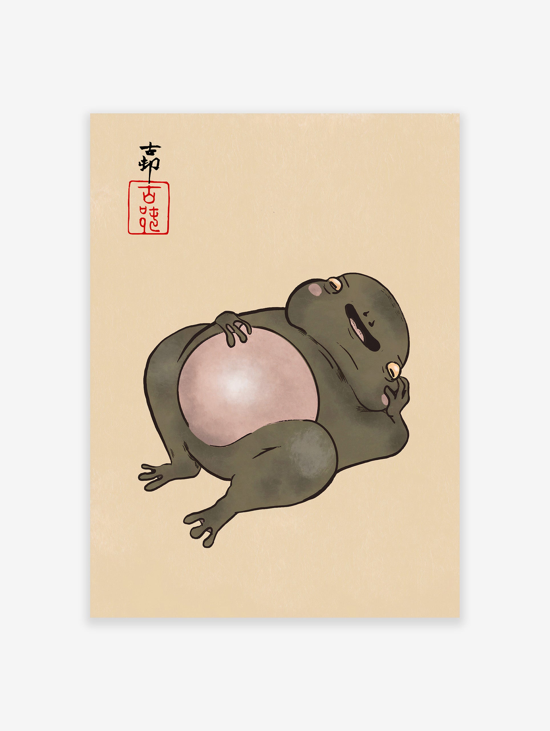 Transform your space with this Matsumoto Hoji Japanese Frog Poster, featuring a delightful depiction of a laughing frog lounging gracefully. Perfect for frog lovers and Japanese animal enthusiasts looking to add whimsical and playful art to their walls.