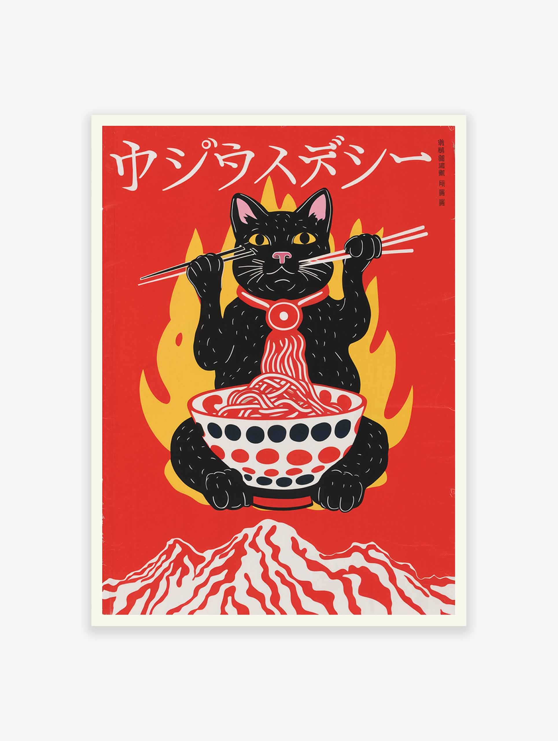 Add a touch of whimsy and culture to your home with our Japanese Cat Poster. This charming piece features a feline friend enjoying a bowl of traditional ramen, perfect for any cat lover or anyone looking to add some unique decor to their space. Bring a smile to your face every time you see it!