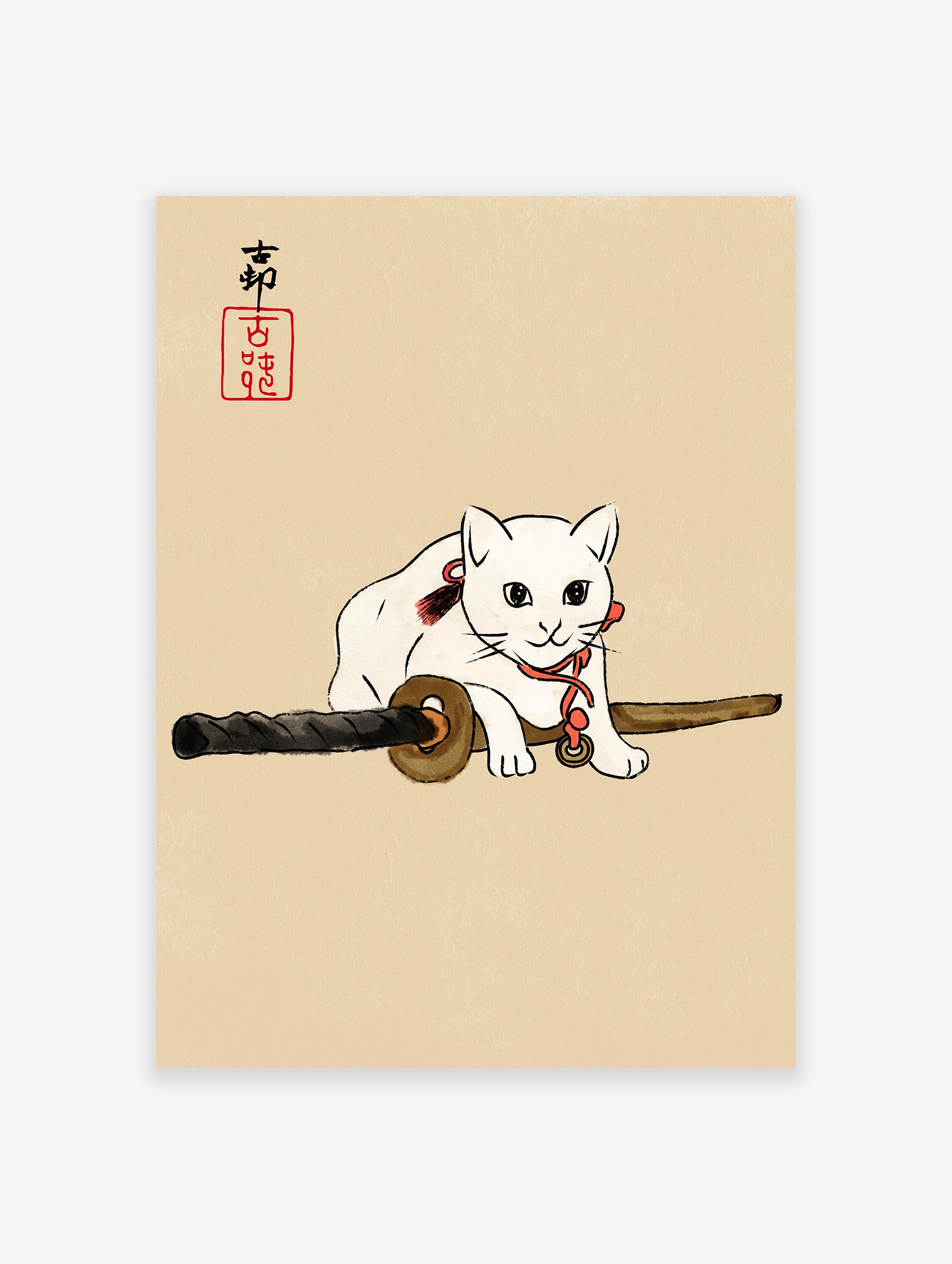 Elevate your space with this striking Japanese white cat and katana print, blending tradition and elegance in one captivating artwork, perfect for cat lovers and enthusiasts of Japanese culture.