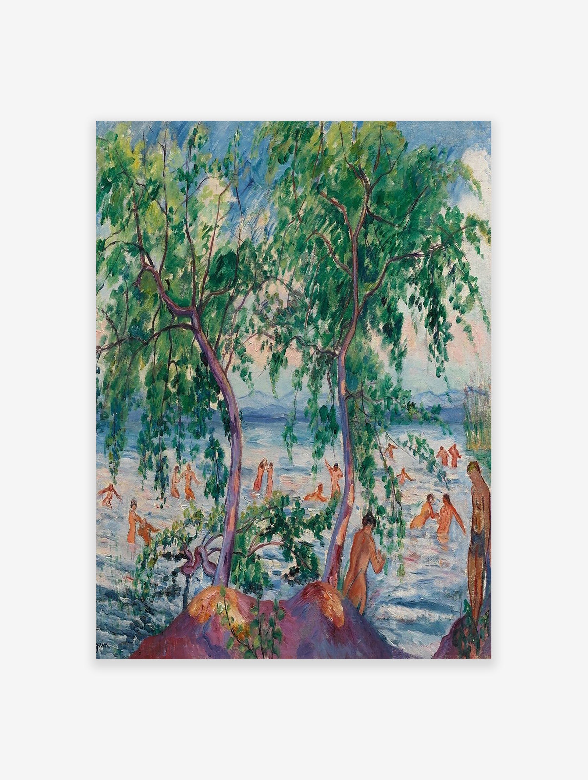 Transform your space with the serene La Baidnade, Colombier Print by Henri Manguin, featuring lush green trees and people enjoying a refreshing dip in a tranquil sea, ideal for adding a touch of nature to your decor.