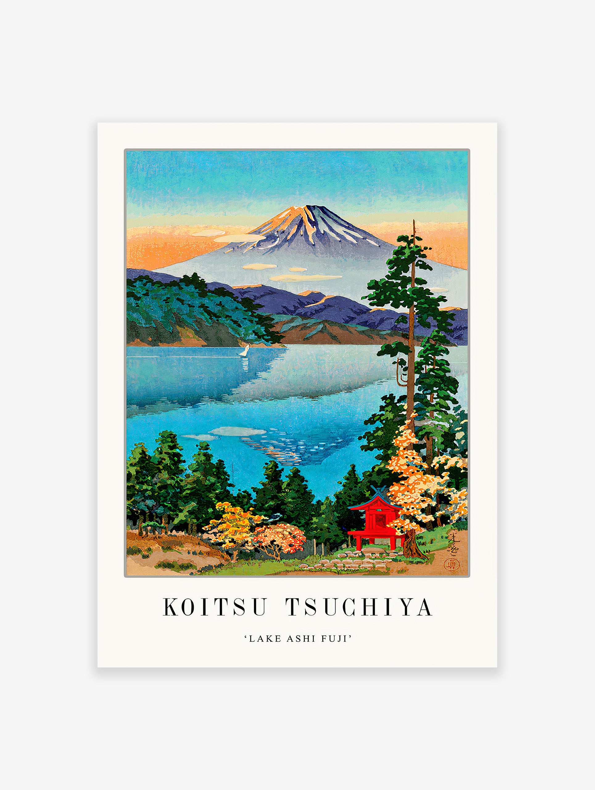 Immerse yourself in the tranquil beauty of this Lake Ashi Fuji Wall Art by Koitsu Tsuchiya, capturing the majestic allure of Mount Fuji against the serene backdrop of a lake. Elevate your space with this captivating artwork, perfect for nature lovers and enthusiasts of Japanese landscape art.