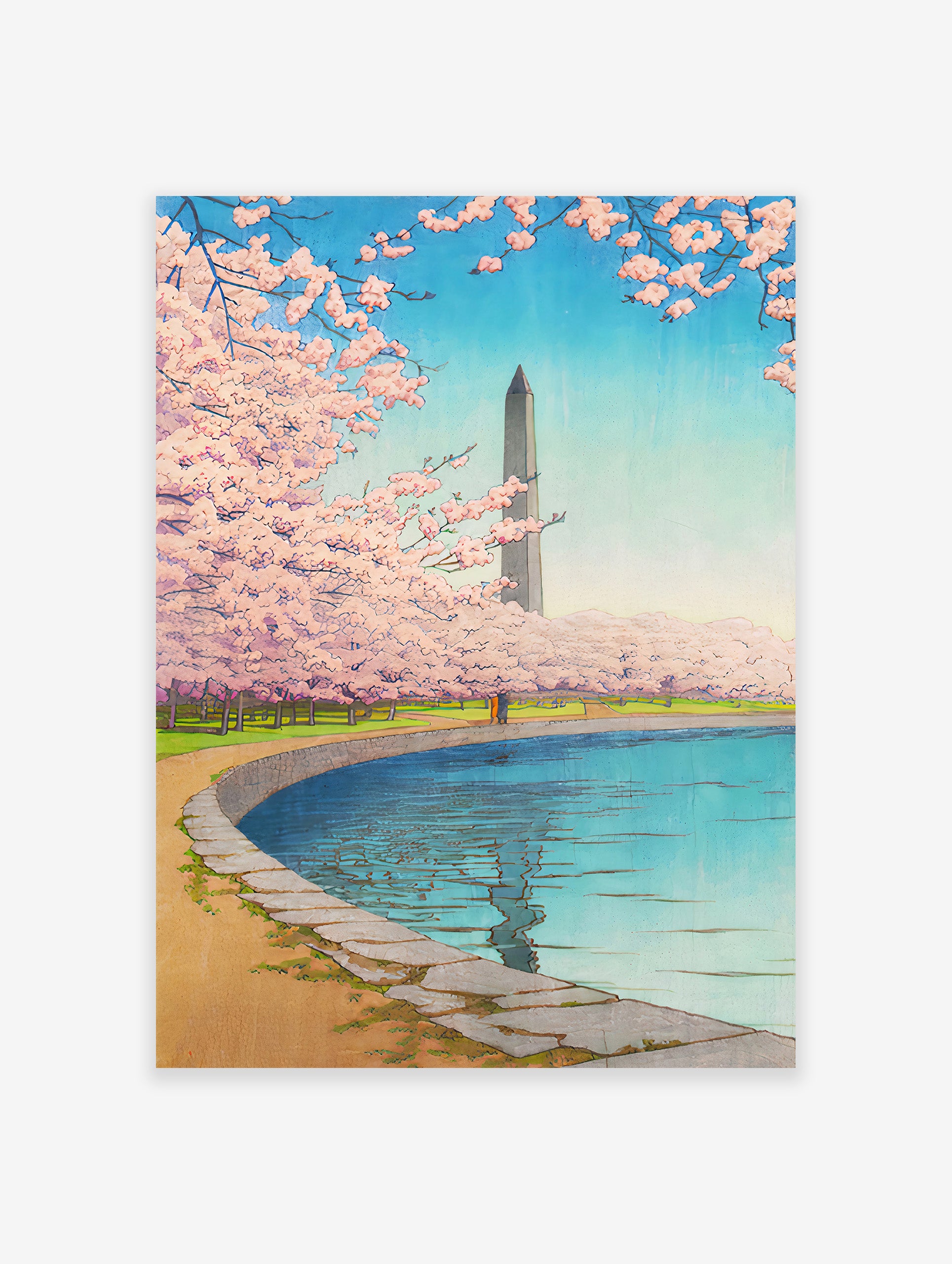 Adorn your space with the serene beauty of Kawase Hasui's Washington Monument Poster, featuring a picturesque lake scene accentuated by the delicate blooms of a Sakura tree. Perfect for nature lovers and those seeking tranquility in their decor, this print brings the calming essence of the outdoors into your home.