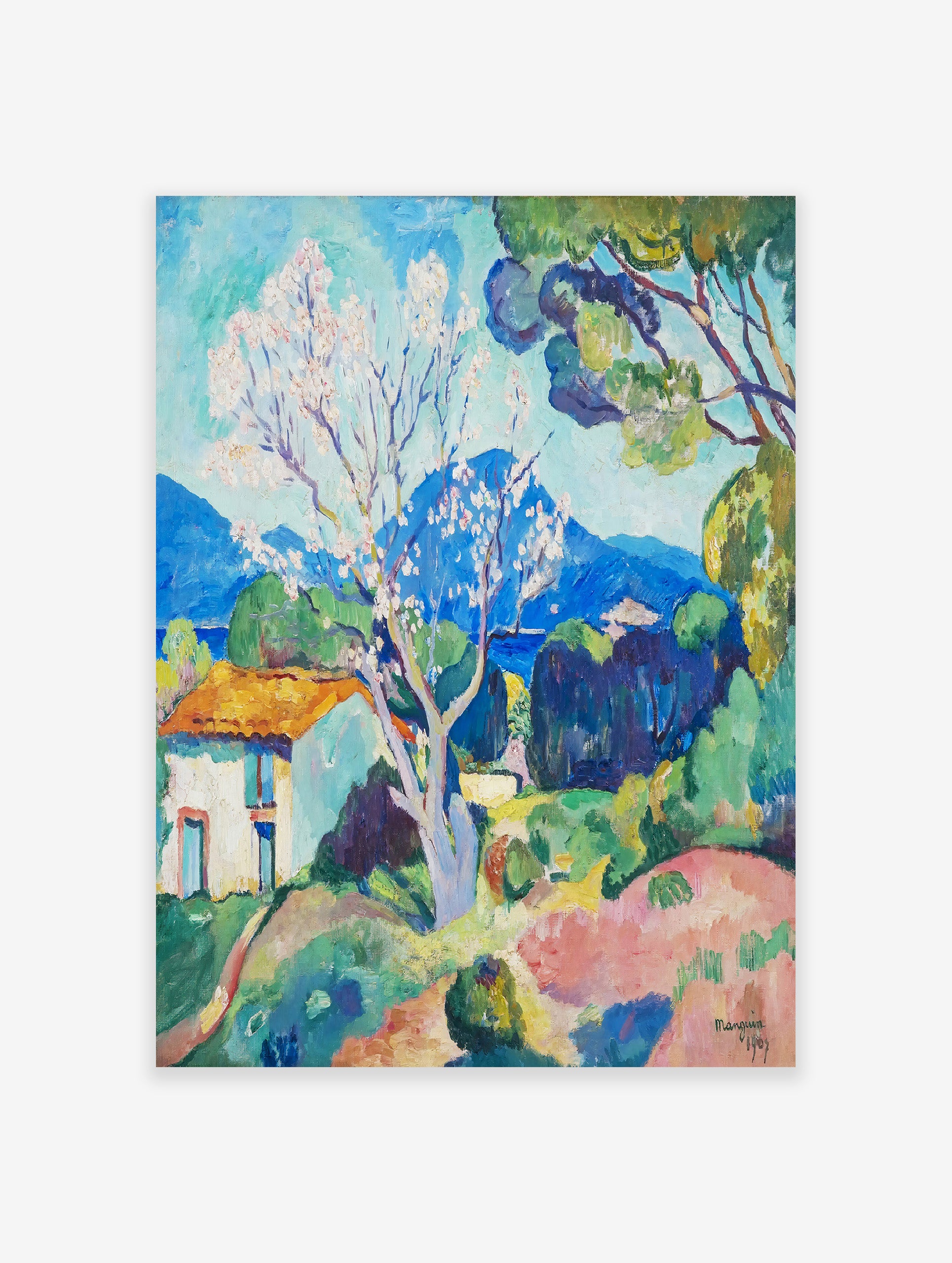 Adorn your walls with the timeless beauty of the L'Amandier en Fleurs by Henri Charles Manguin, featuring a charming depiction of a house nestled amidst blooming almond trees in the forest. Elevate your space with this exquisite Henri Charles Manguin poster, capturing the serene essence of nature's splendor.
