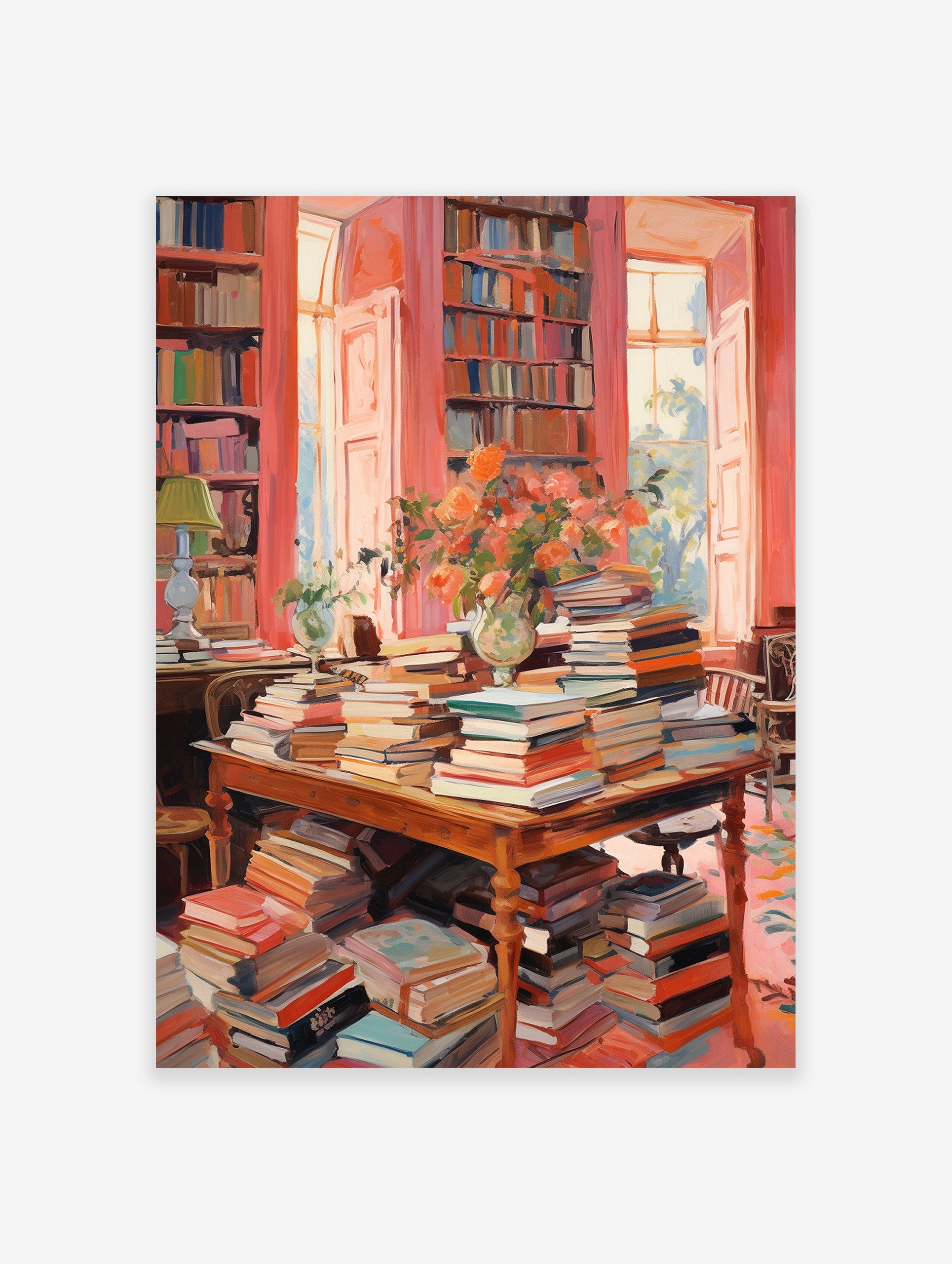 Discover our captivating Library Print featuring a picturesque book aisle adorned with botanical prints, offering a harmonious blend of literature and nature in vibrant pink tone. Elevate your space with this enchanting fusion of books and botanical art.