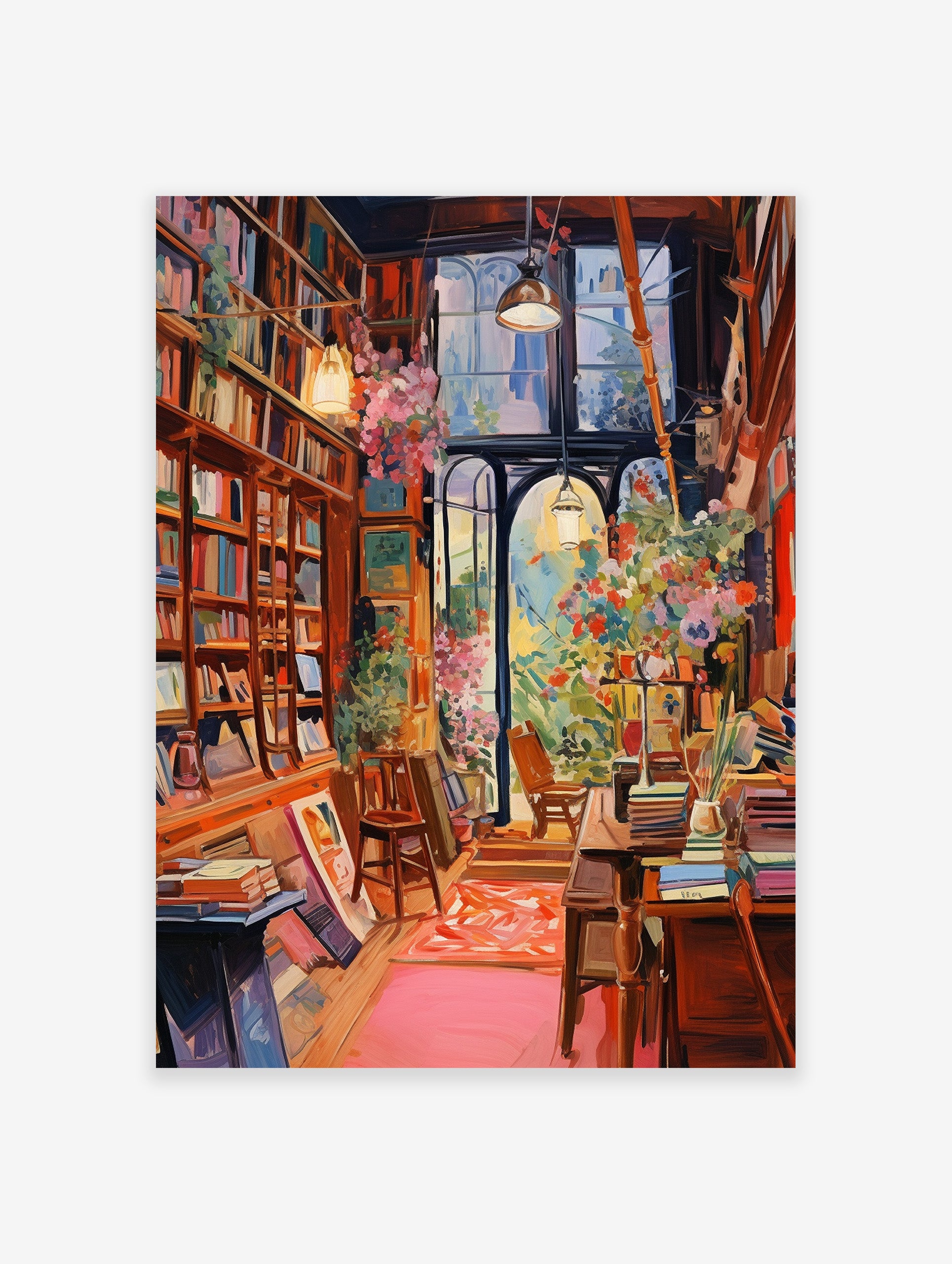 Discover our captivating Library Wall Art featuring a picturesque book aisle adorned with botanical prints, offering a harmonious blend of literature and nature in vibrant multi-colored tones. Elevate your space with this enchanting fusion of books and botanical art.