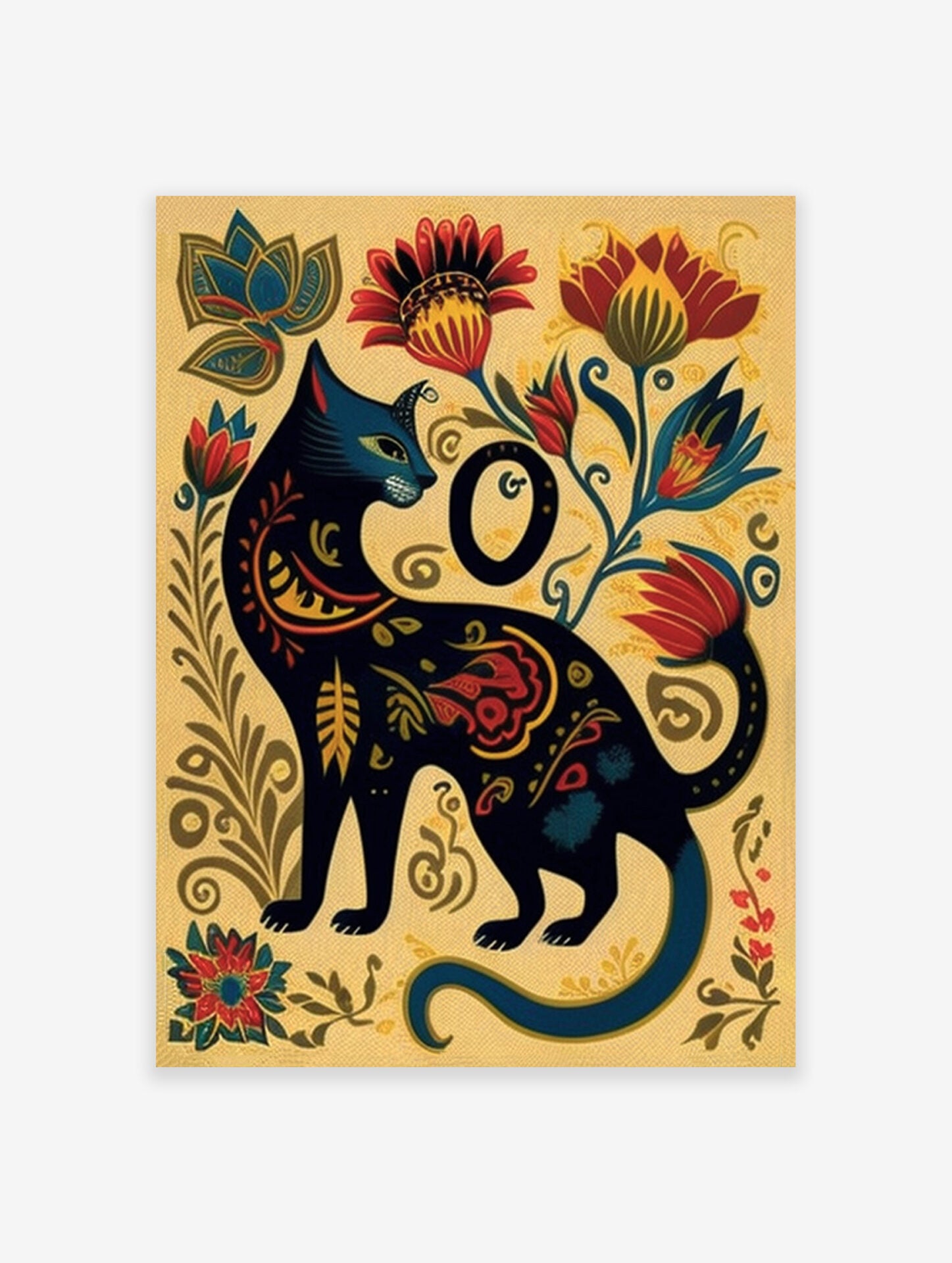 Discover our enchanting black cat poster, a captivating piece of Mexican wall art that adds a touch of mystique and charm to your home decor. This beautifully illustrated black cat poster showcases a striking black cat adorned with vibrant floral motifs, infusing your space with a fusion of Mexican culture and feline grace.