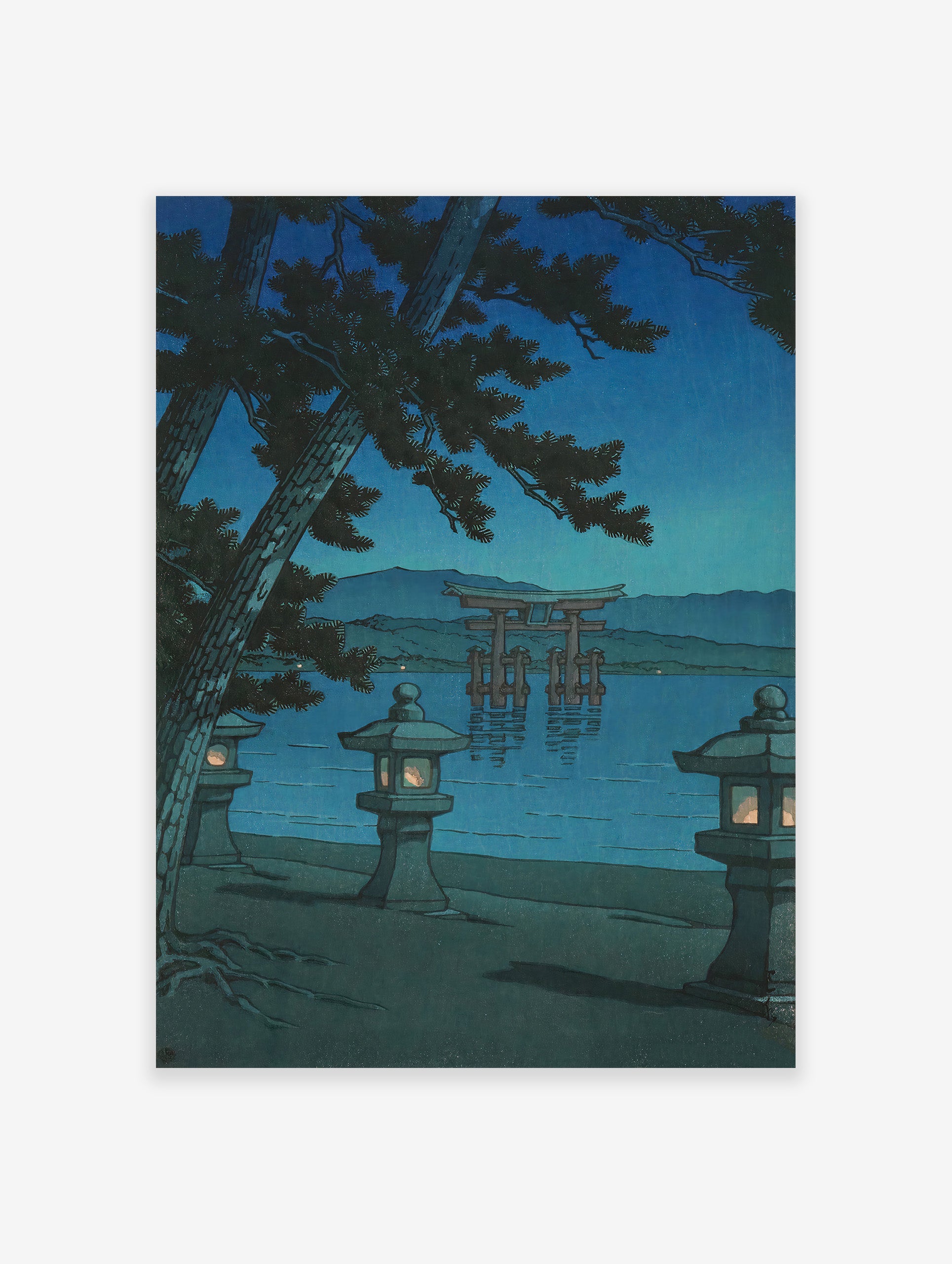 Transform your space with this mesmerizing Hasui Kawase Poster, depicting a serene moonlit night scene featuring a Japanese gate on the lake, all bathed in a soothing blue tone. Perfect for adding a touch of tranquility and Japanese elegance to your home decor.