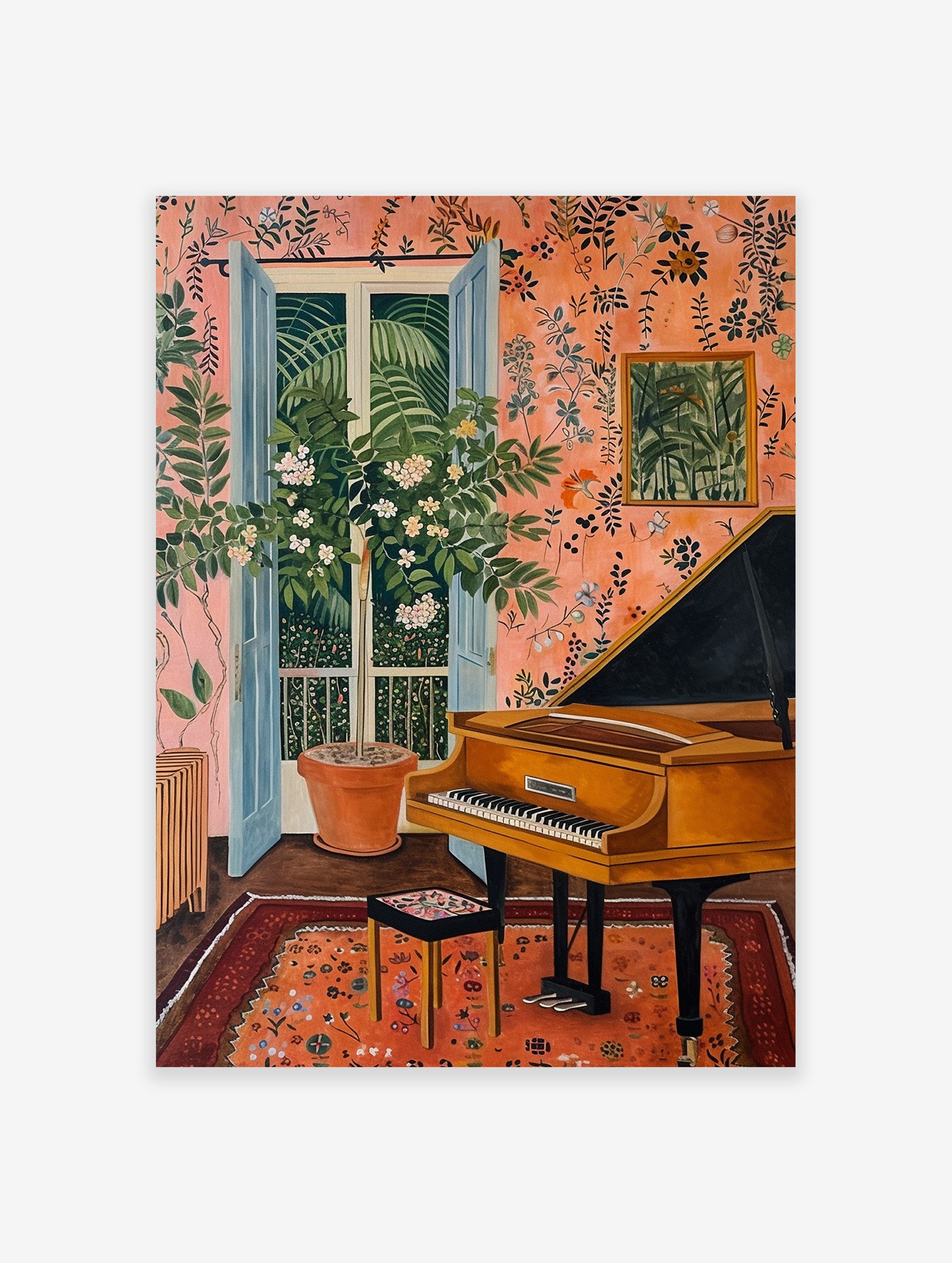 Elevate your space with our Piano Poster featuring a serene room adorned with lush green botanical prints, ideal for music enthusiasts and nature lovers alike.