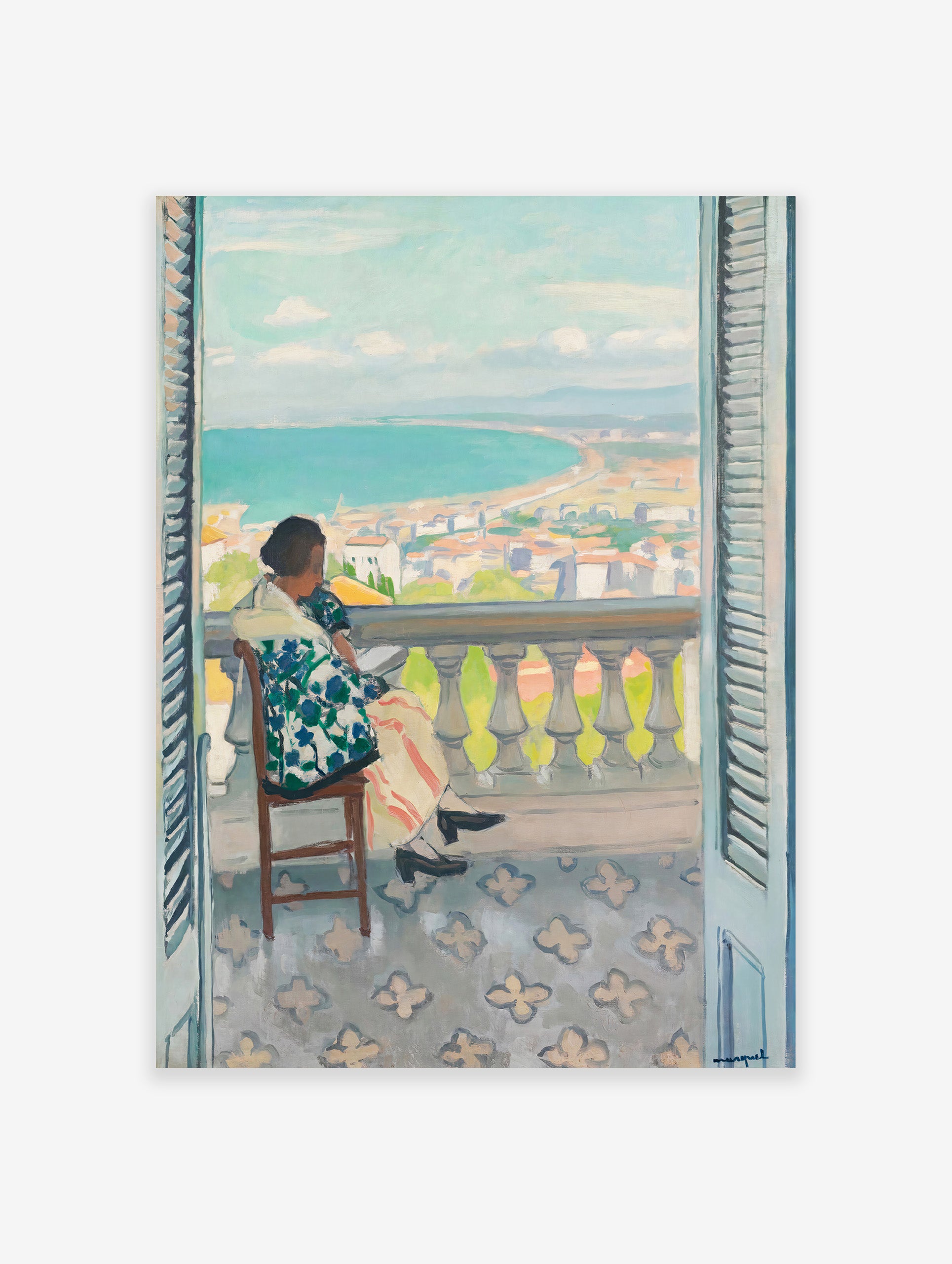 Bring timeless elegance to your space with Reading Madame by Albert Marquet, featuring a woman in a floral top immersed in a book on a serene balcony, all bathed in a soothing blue tone. This Albert Marquet Poster adds a touch of classic sophistication to any room, perfect for those seeking beauty and tranquility in their decor.