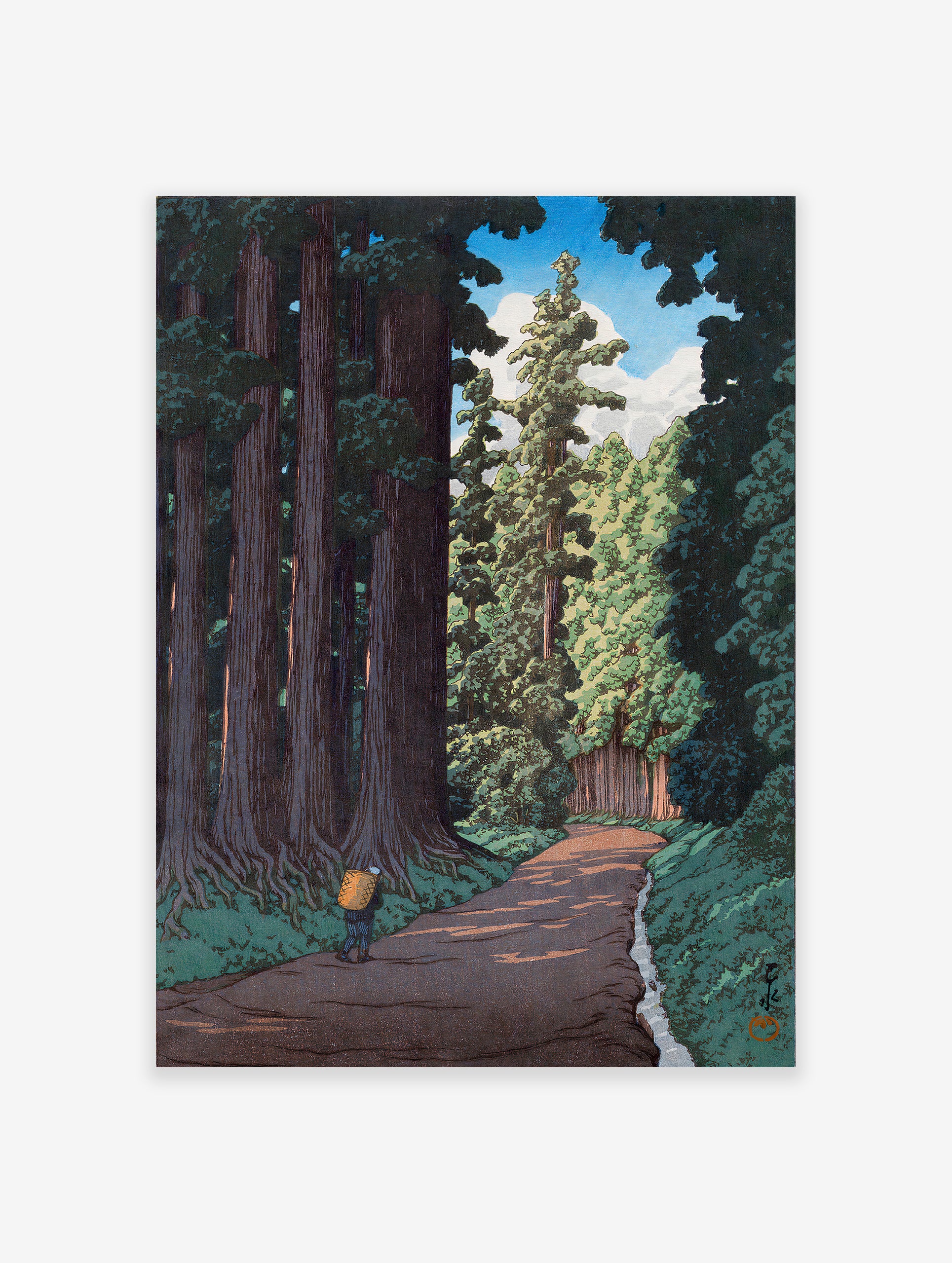 Immerse yourself in the serene beauty of this Kawase Hasui Poster, featuring the enchanting "Road to Nikko" through a lush forest with towering trees, all depicted in a soothing green tone. Perfect for collectors of Japanese art and nature enthusiasts, this print captures the timeless allure of nature's tranquility.