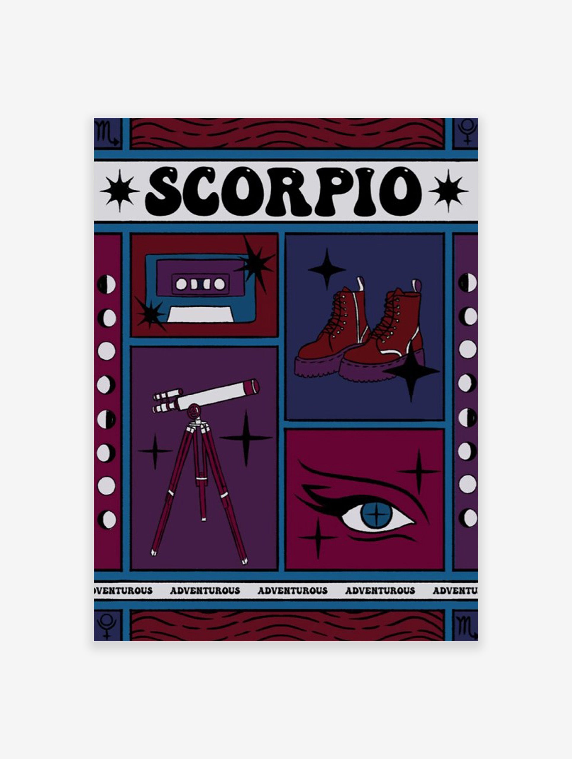 Elevate your space with our Scorpio Zodiac poster, featuring retro-inspired elements and a striking depiction of the Scorpio sign in rich purple tone. Perfect for astrology enthusiasts seeking a stylish addition to their home decor.