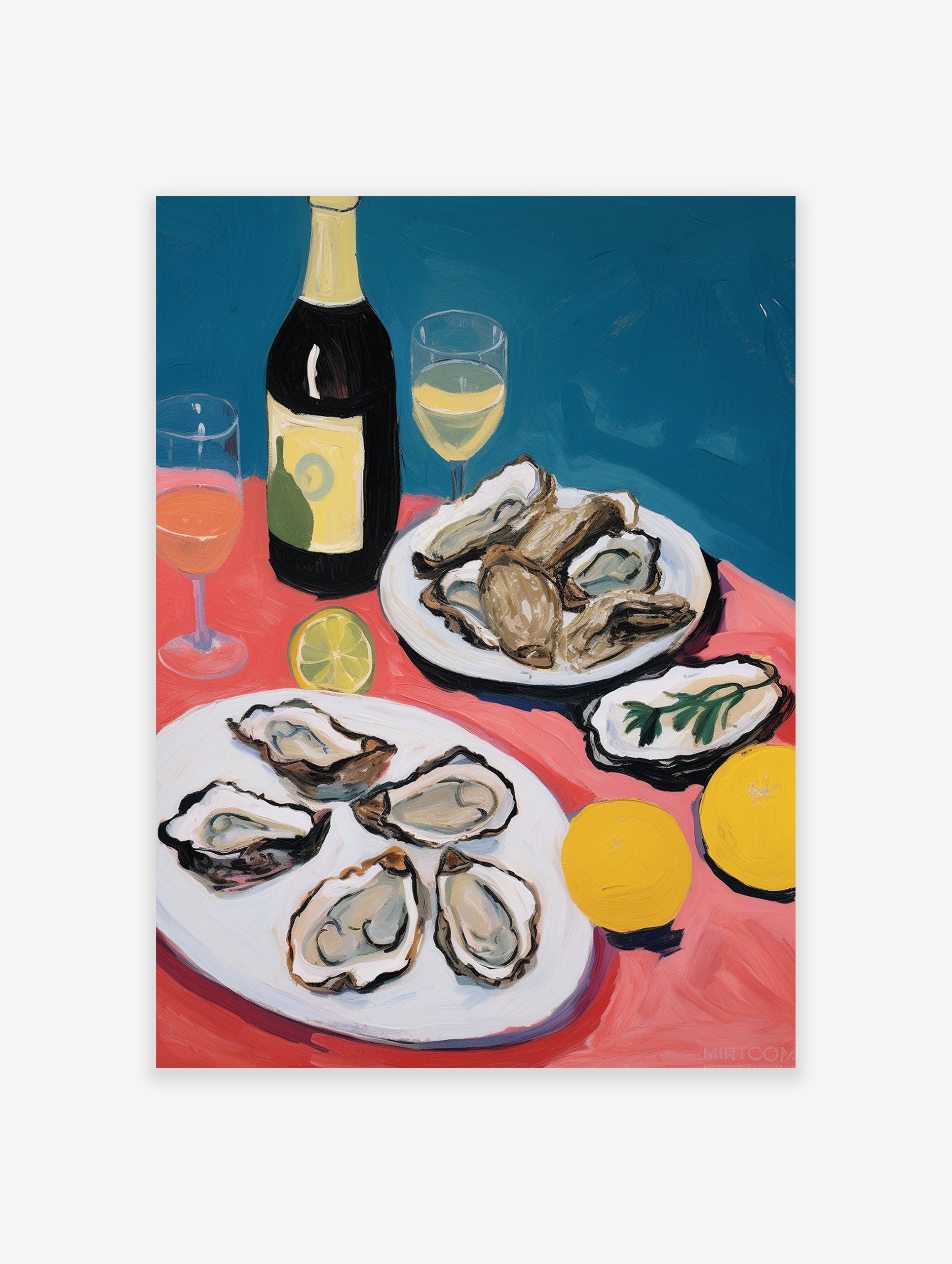 Transform your space with our Seafood Wall Decor, showcasing a vibrant red table adorned with delectable oysters and a glass of fine wine, bringing a touch of seaside elegance to your home decor.
