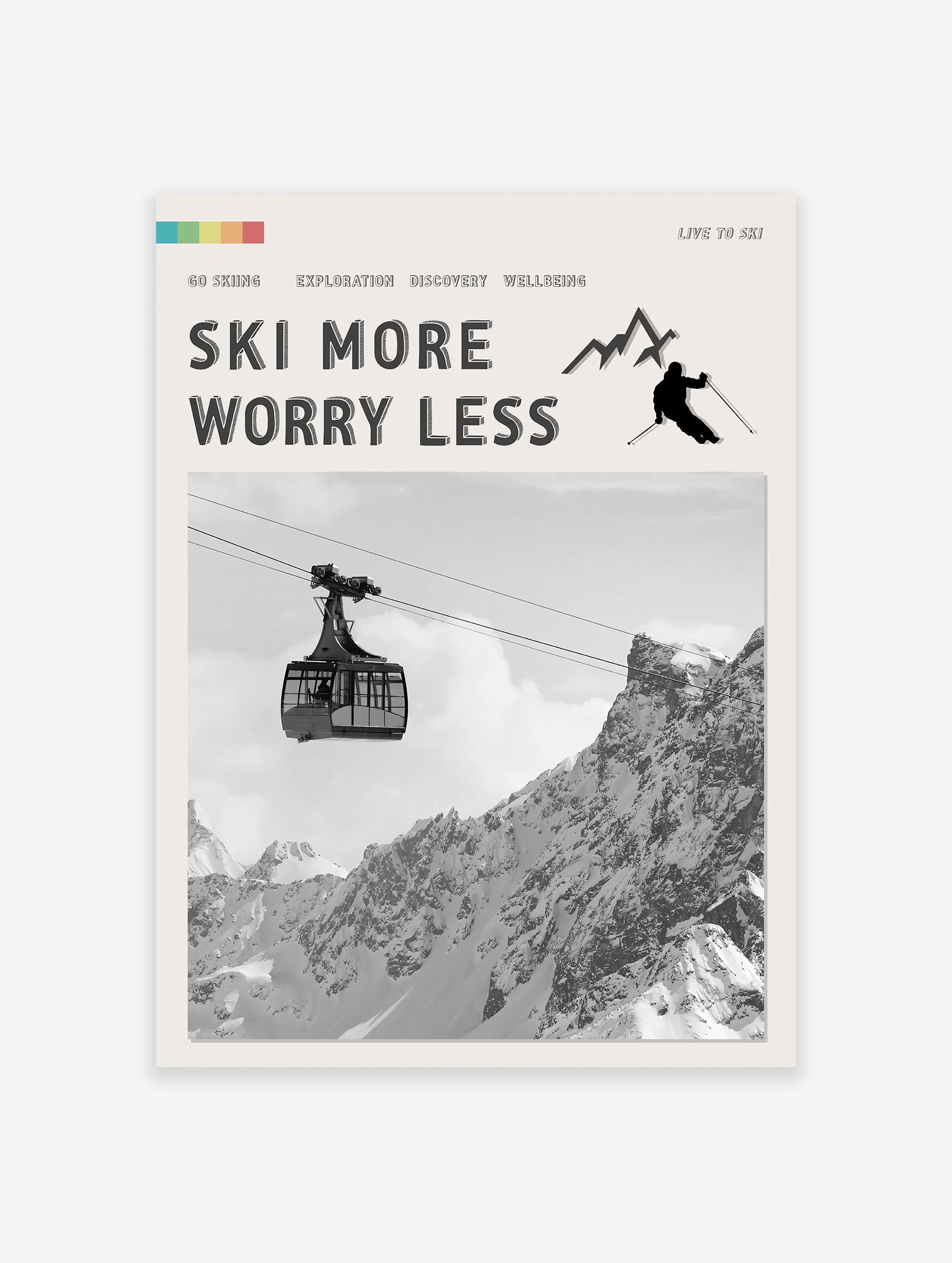 Transform your walls with this black and white ski poster featuring an uplifting quote, "ski more, worry less", and an iconic ski lift, perfect for ski enthusiasts seeking motivational decor. Ideal for adding a touch of adventure and positivity to any space.