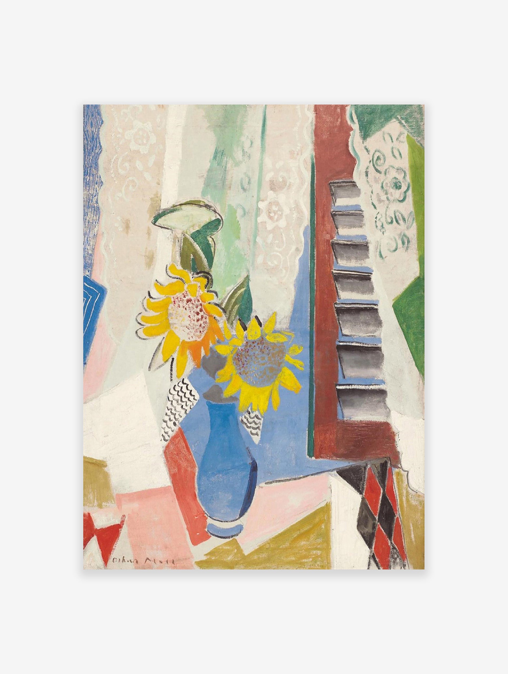 Illuminate your space with the vibrant charm of Sunflowers With Shutter by Oskar Moll, featuring an abstract depiction of sunflowers in a striking blue vase. Elevate your decor with this captivating artwork, perfect for sunflower enthusiasts and art admirers seeking unique pieces for their homes.