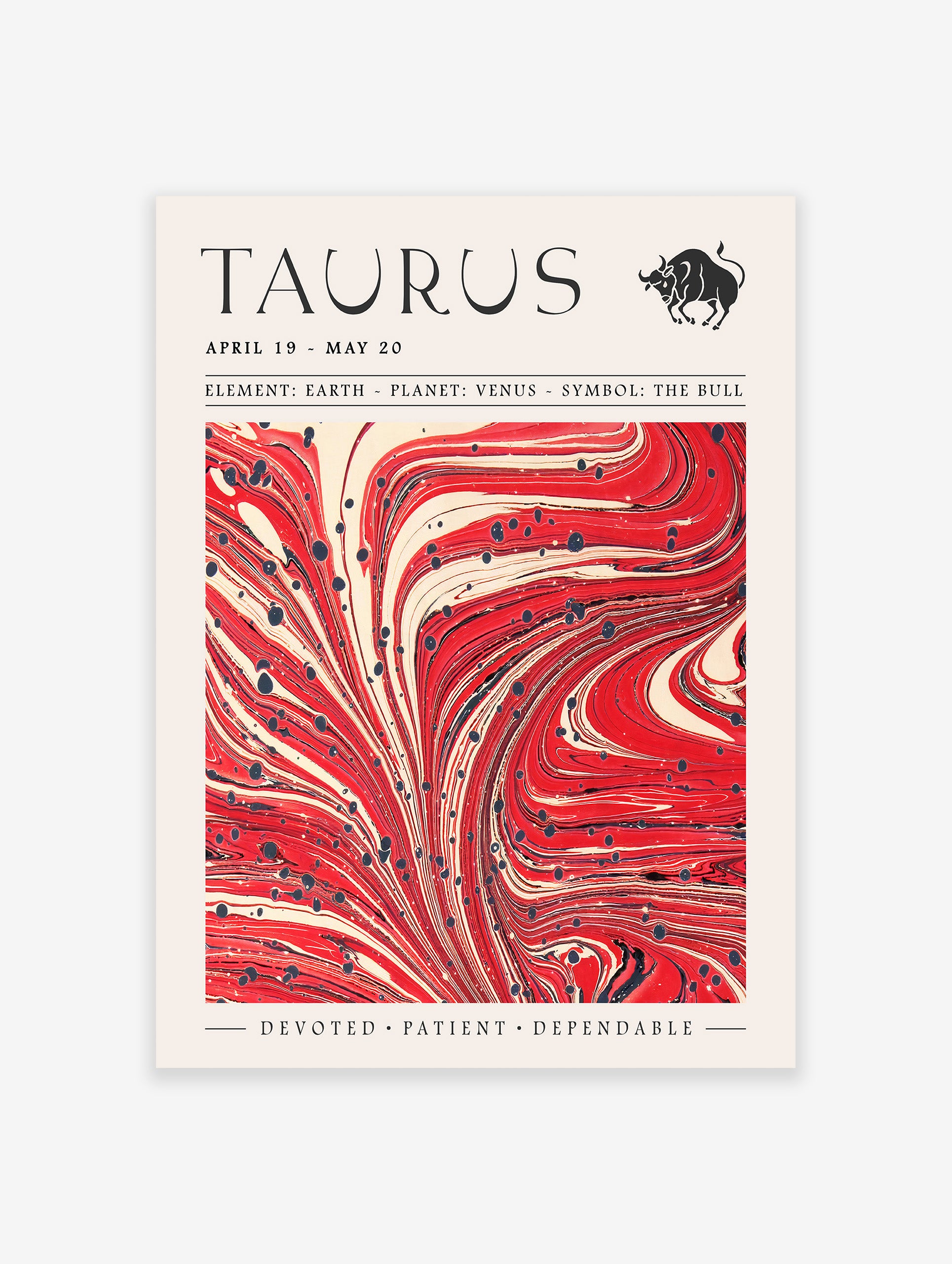A Taurus Zodiac Poster, showcasing vibrant red marble pattern intertwined with distinctive Taurus typography, an ideal addition to any astrology-themed decor. Elevate your space with this eye-catching poster, perfect for astrology enthusiasts, home offices, and dorm rooms.
