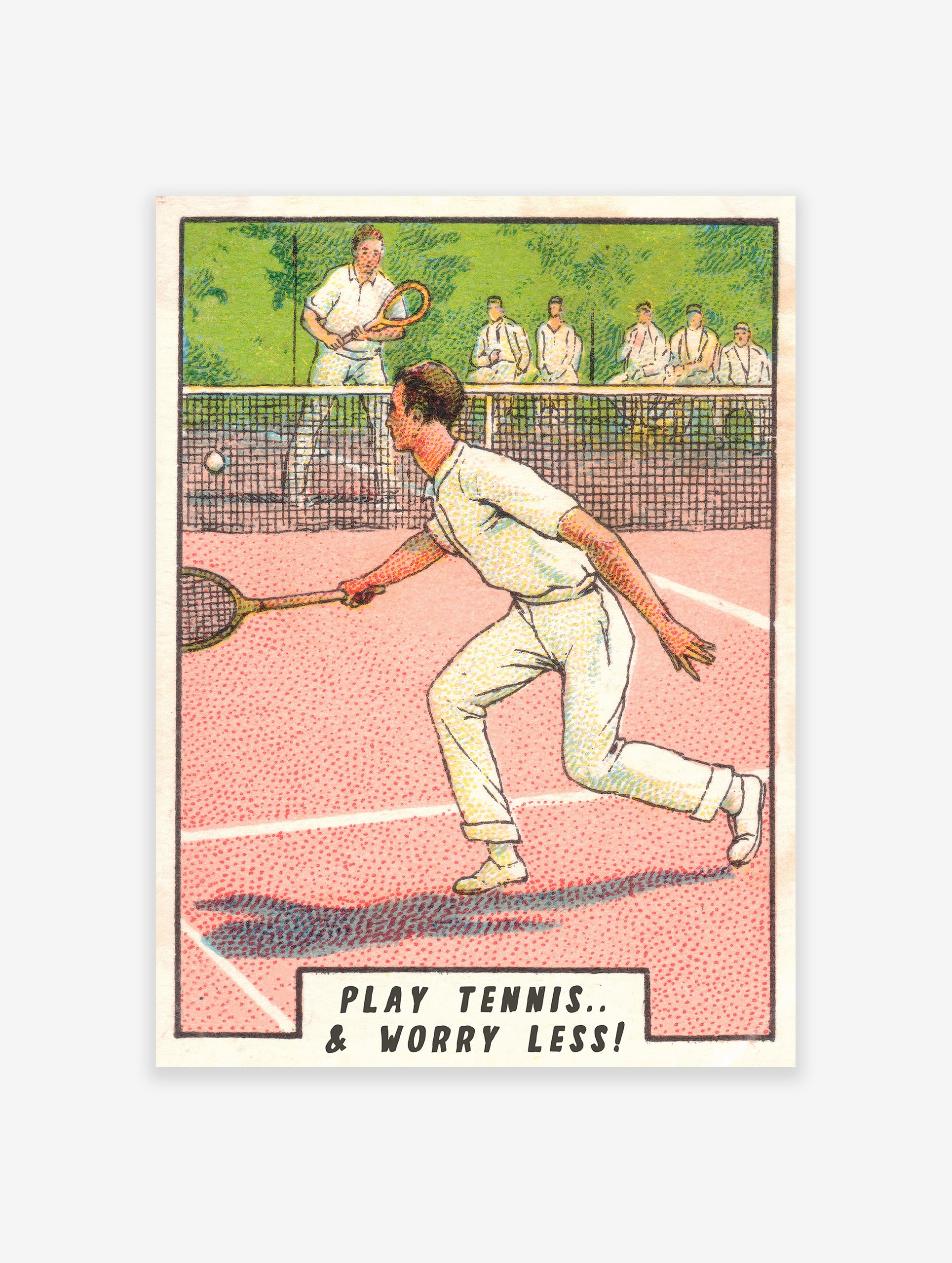 Elevate your decor with this vintage tennis poster showcasing players in crisp white attire, complemented by an inspiring quote encouraging you to "play tennis and worry less." Perfect for tennis enthusiasts seeking motivational artwork to adorn their walls.