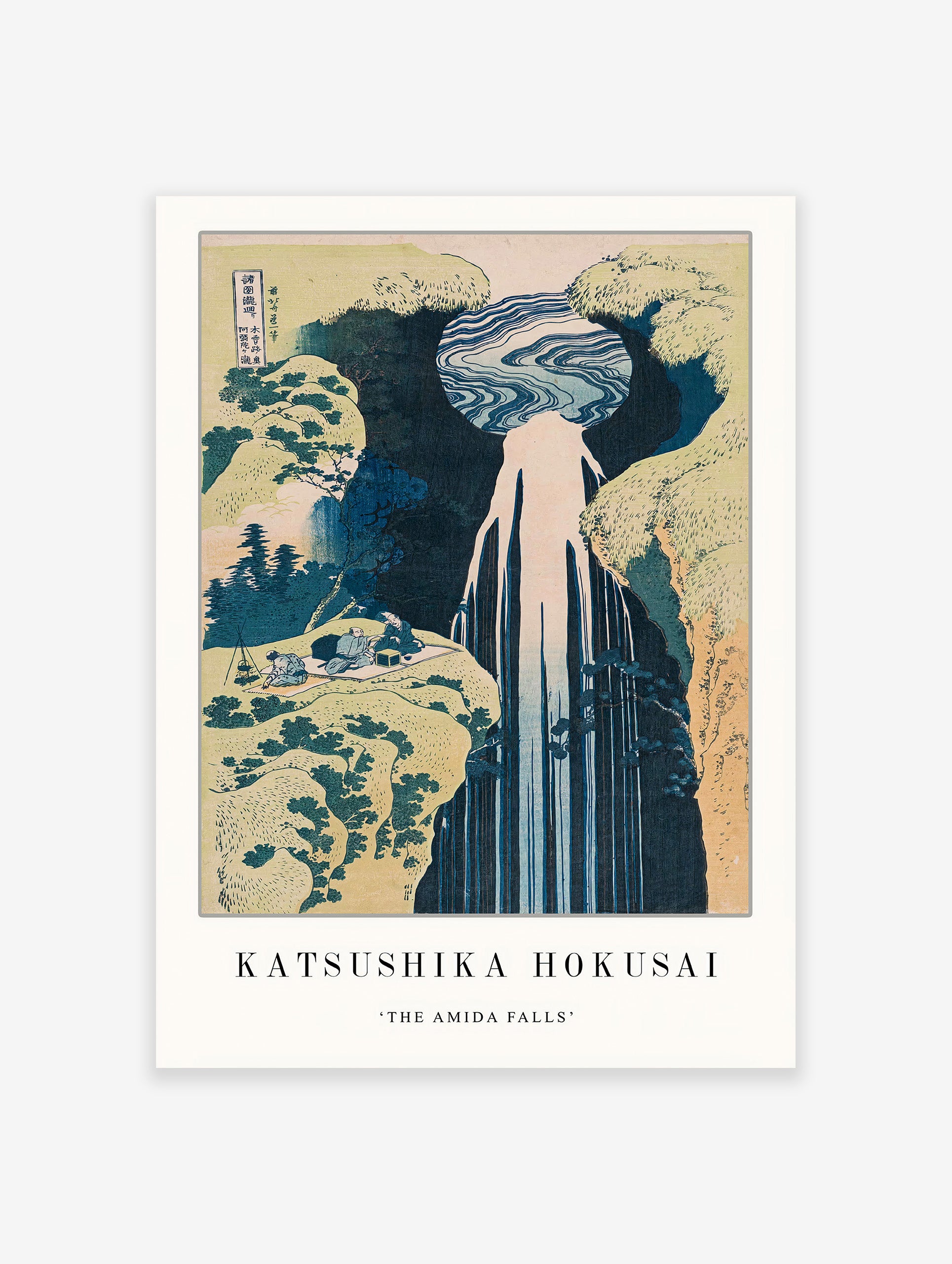 Immerse yourself in the tranquil beauty of The Amida Falls Print by Katsushika Hokusai, featuring a majestic cliff and a serene blue waterfall, perfect for nature lovers and art enthusiasts. Elevate your space with this captivating artwork, ideal for Japanese art collectors, landscape admirers, and home decor enthusiasts.