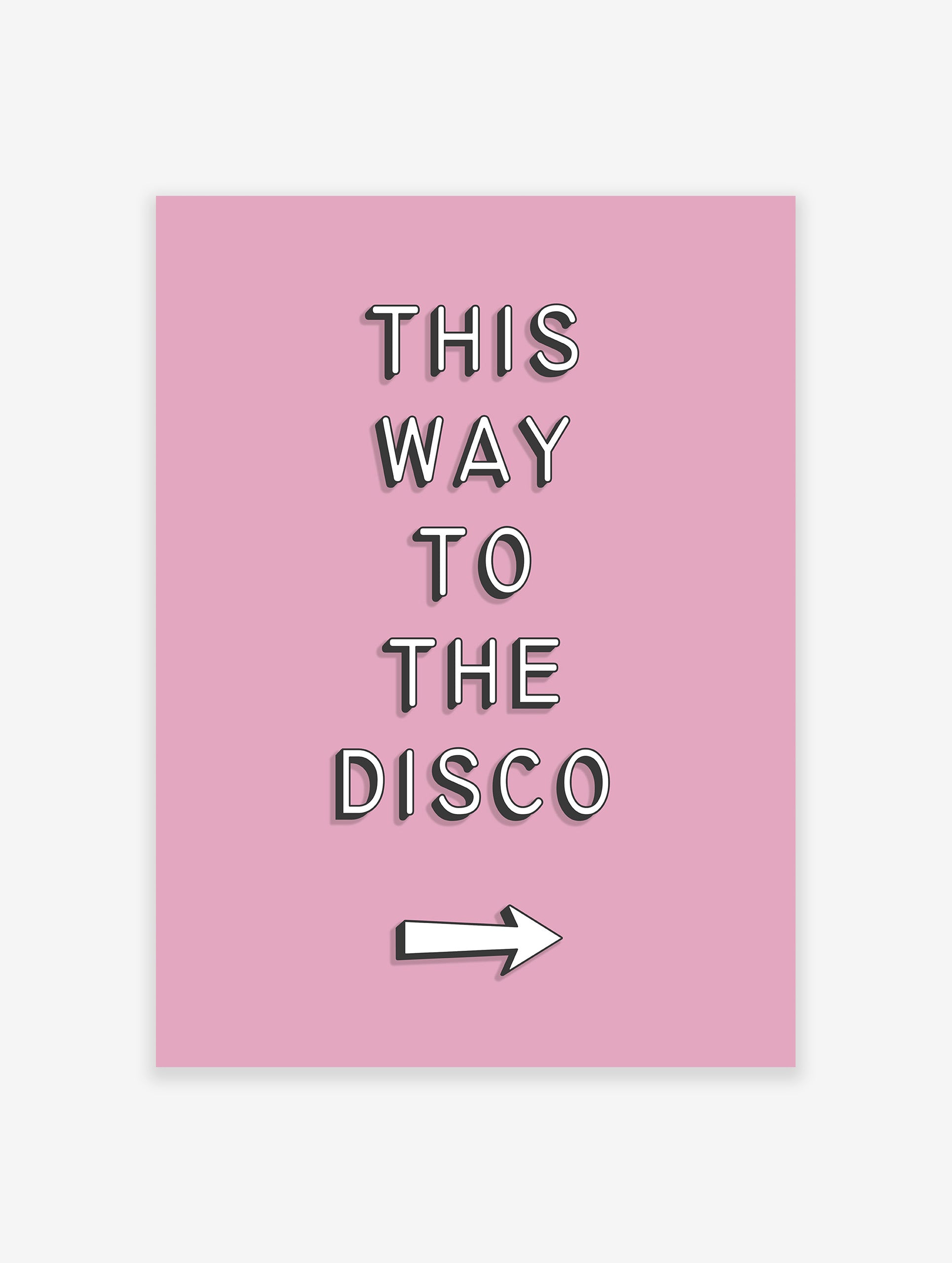 Add a retro vibe to your space with this typography print featuring a playful 'This Way to the Disco' sign in vibrant pink tone, perfect for adding flair to any room or party space.