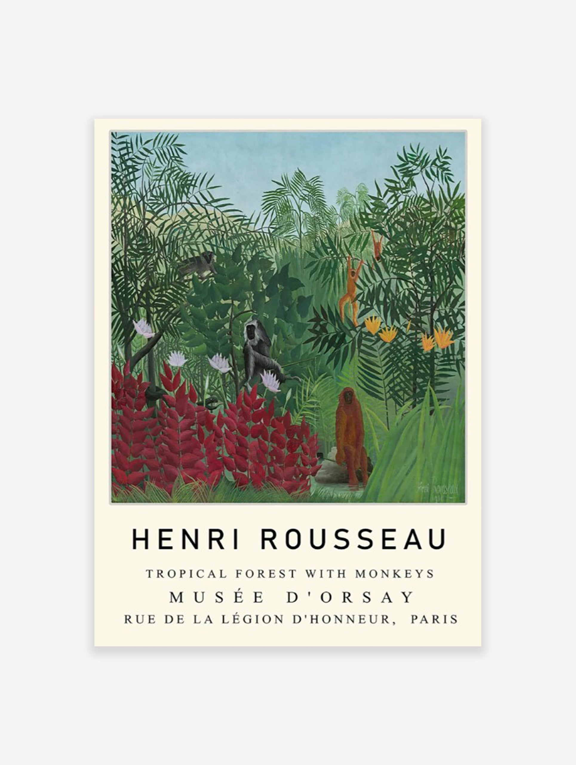 Transform your room with the enchanting 'Tropical Forest With Monkeys' print by Henri Rousseau, featuring playful monkeys amidst a vibrant green jungle. Perfect for nature lovers and art enthusiasts seeking tropical-themed wall decor.