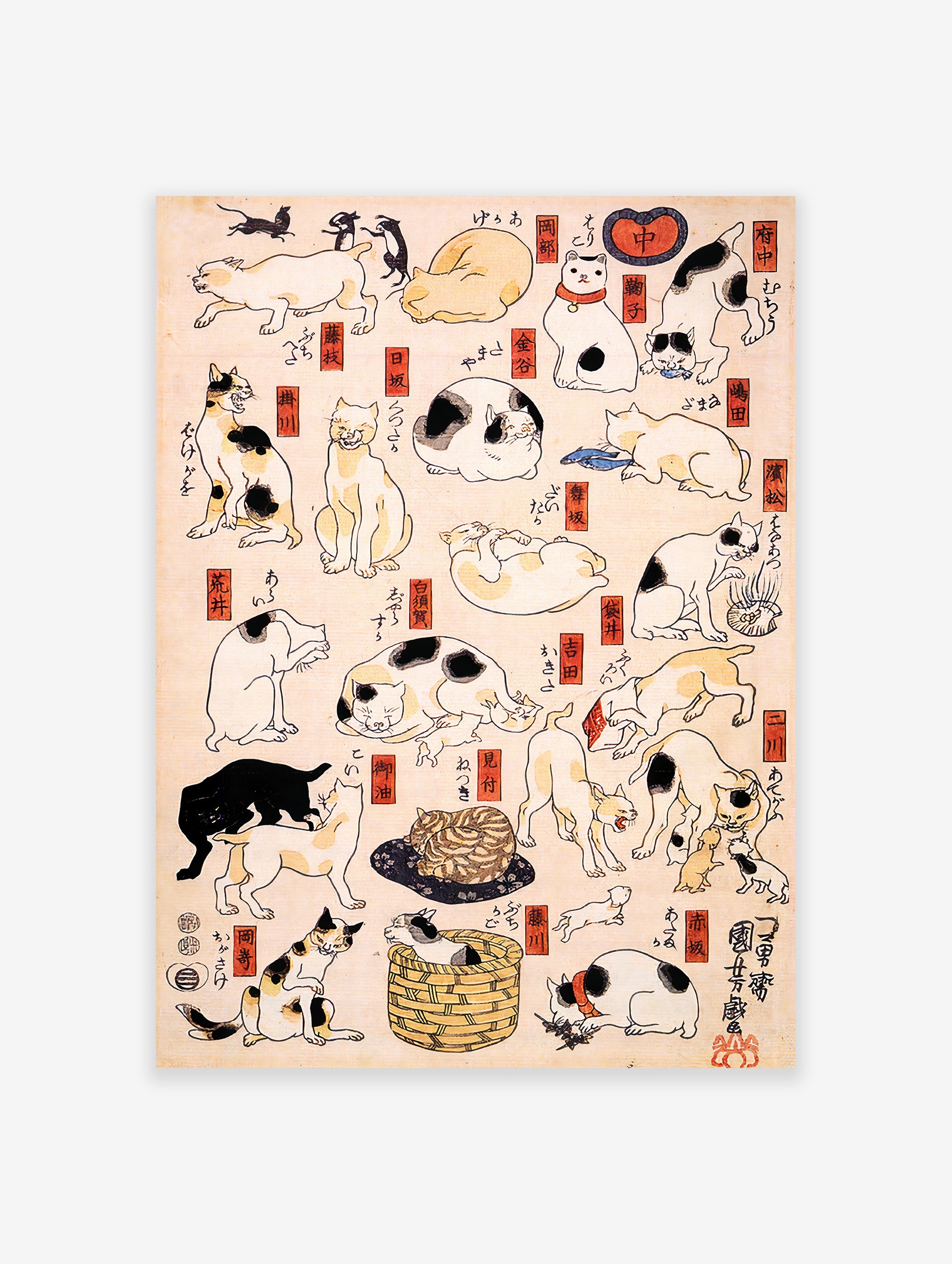 Transform your space with this captivating poster of cats by Utagawa Kuniyoshi, showcasing delightful images of Japanese cats in a warm beige tone. Perfect for cat lovers and art enthusiasts alike, this poster adds a touch of elegance and charm to any room.