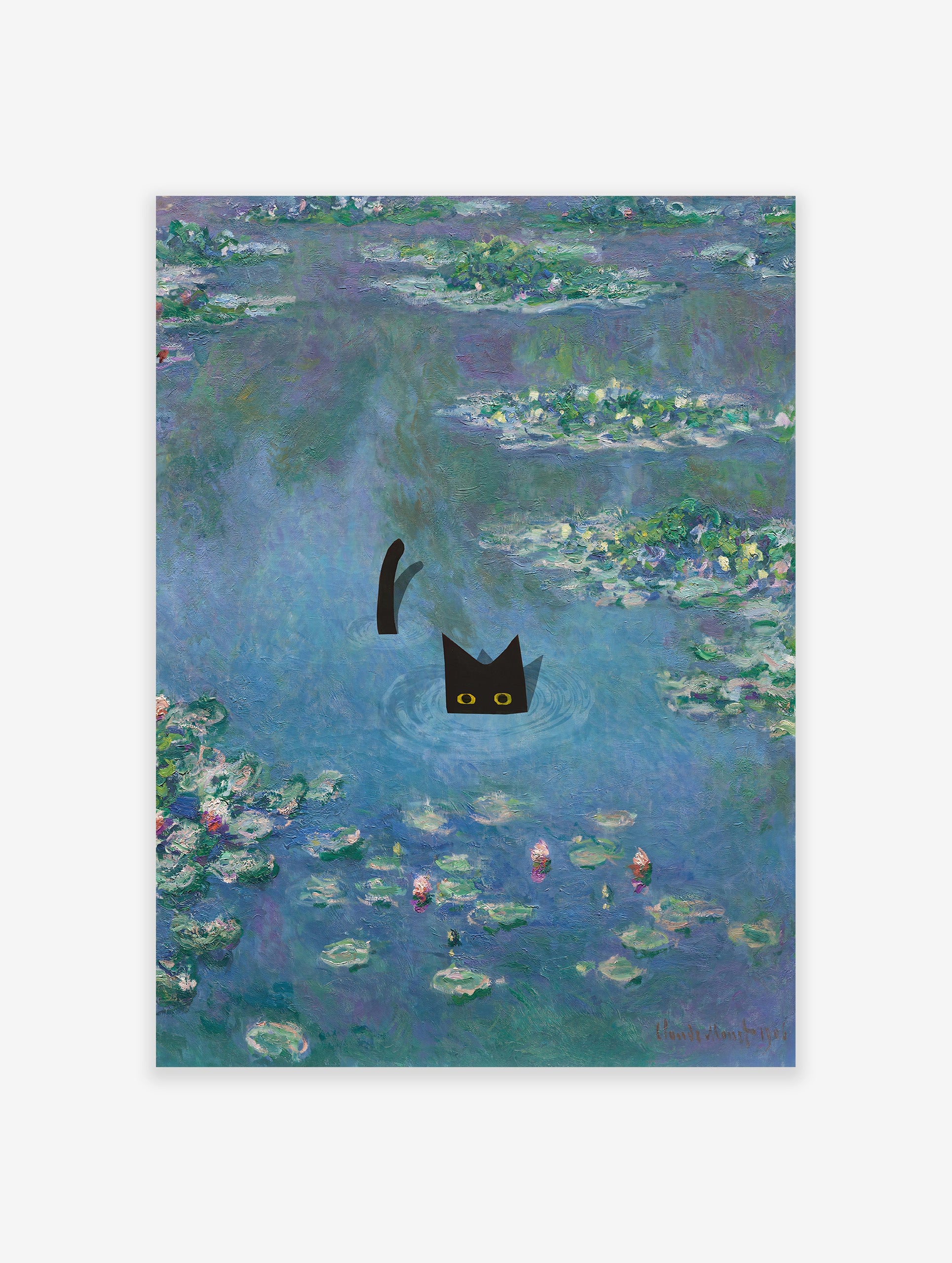 Add A touch of feline flair to your decor with this Funny Black Cat Poster, featuring a mischievous feline strolling atop waterlilies in a serene pond, inspired by Claude Monet's iconic artwork. Perfect for cat lovers and art enthusiasts alike, this poster brings together playful charm and artistic beauty to any space.