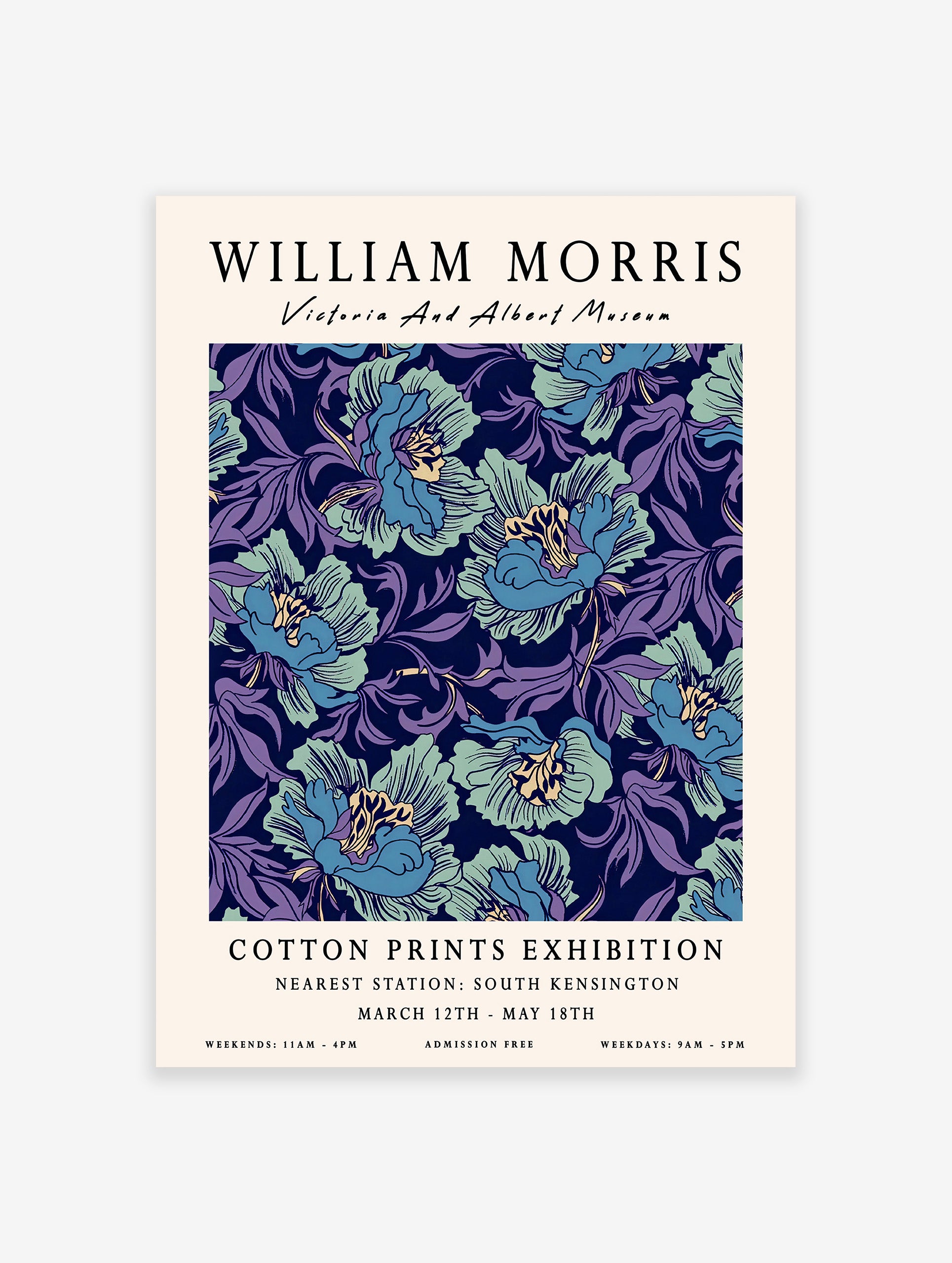 Immerse your space in the exquisite beauty of nature with this purple William Morris Exhibition Print, featuring intricate floral patterns presented in a soothing purple tone. Perfect for enthusiasts of William Morris's iconic designs and those seeking to add a touch of botanical charm to their decor.